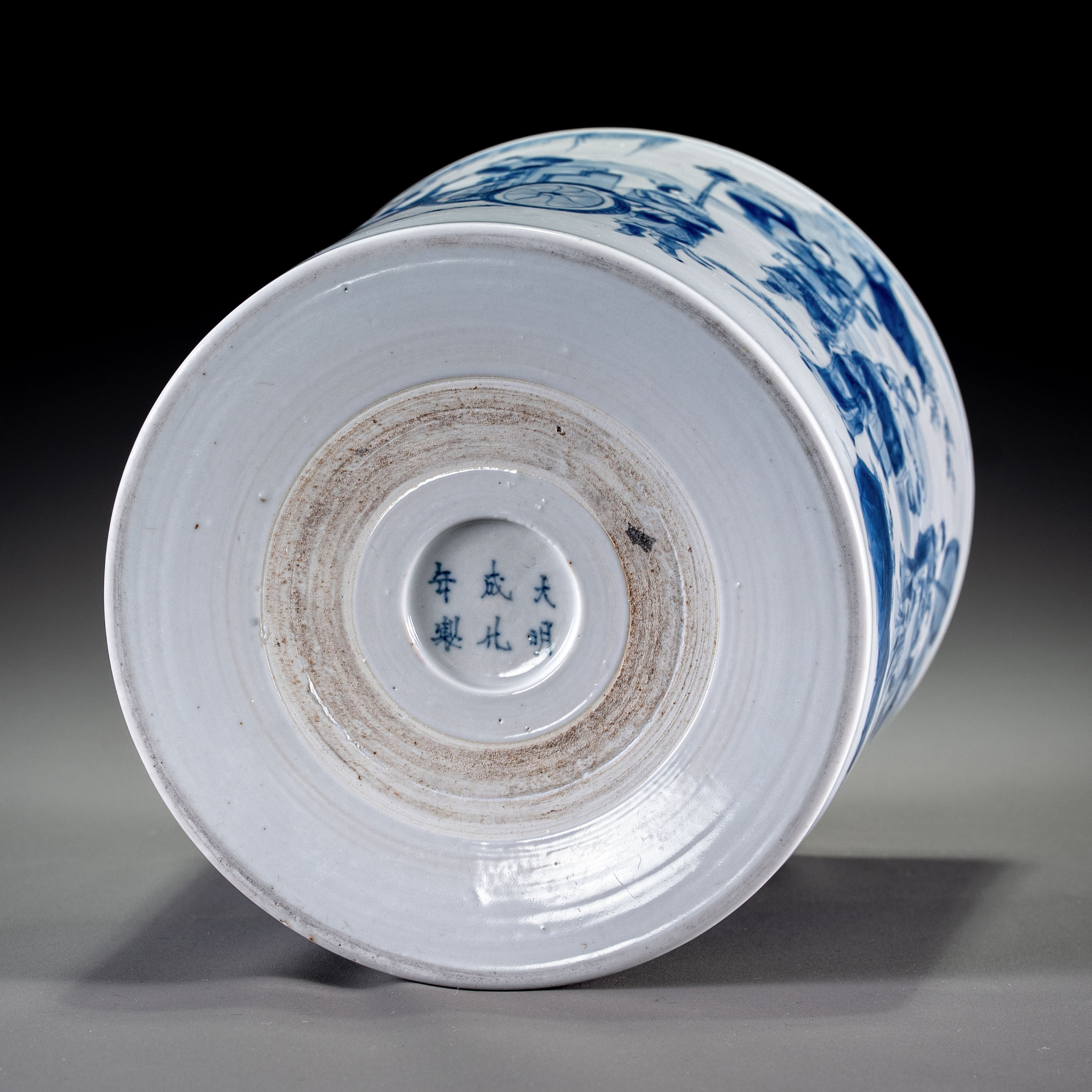 此件清康熙青花人物笔筒,胎体坚致,釉面莹润,整体青花发色淡雅脱俗,呈现出康熙早期“墨分五色”的典型韵味。底署“大明成化年制”六字楷书寄托款,书法遒劲规整,是康熙朝对前朝名品致敬的典型表现。尤为难得的是,该器保存状态极佳,底部原始的“粘沙”现象清晰可见,保留了景德镇早期垫烧工艺原汁原味的状态,未经人为磨损,极具实物考证价值。