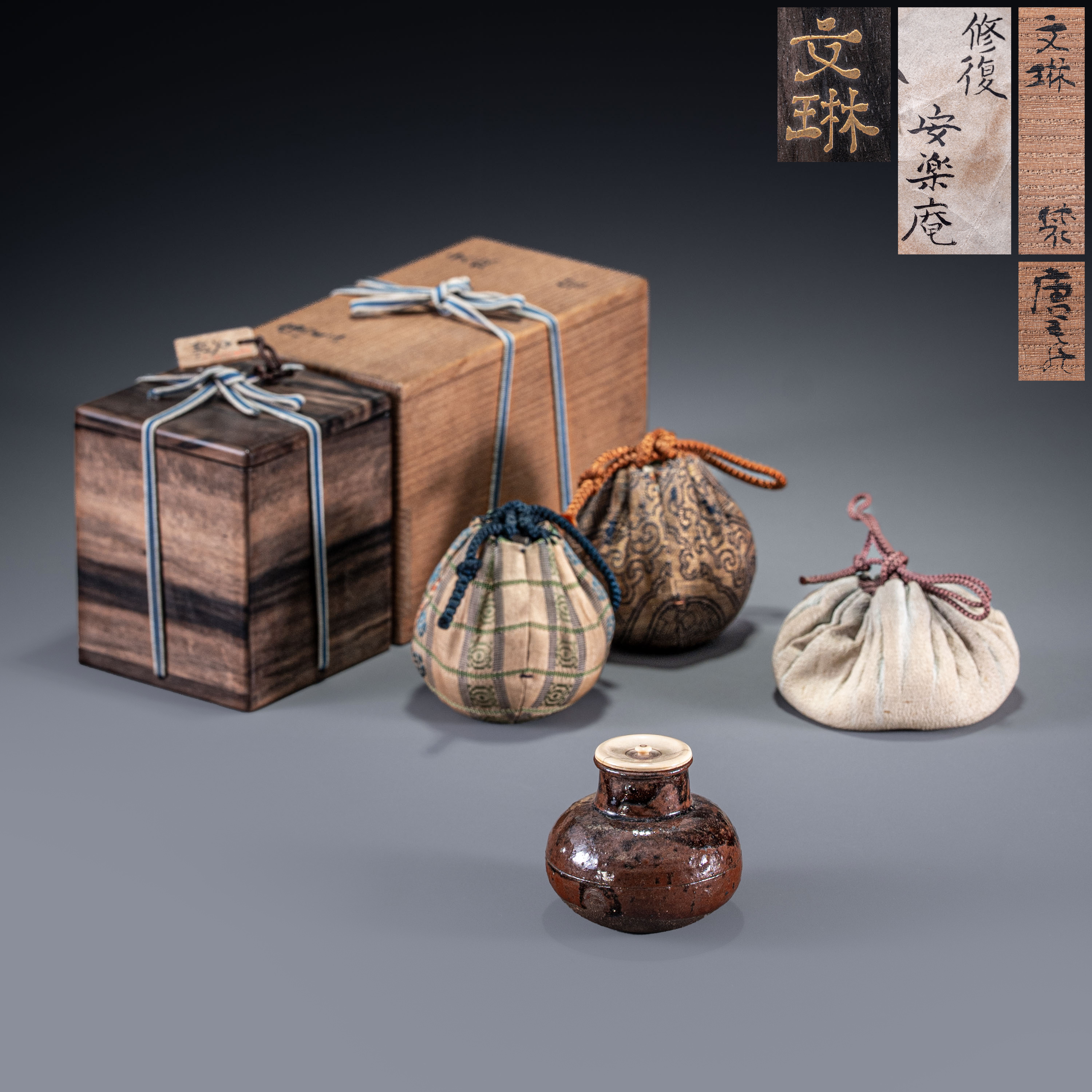 本品随附原装木盒与精美仕覆,其供箱上赫然题有“文琳”之名。这种器型(丸壶)与定名(文琳)的“错位”,反映了前任主人对这件唐物茶入的极度偏爱,特赋予其等级更高的“文琳”美名,是日本茶道收藏文化中极具趣味的一环。