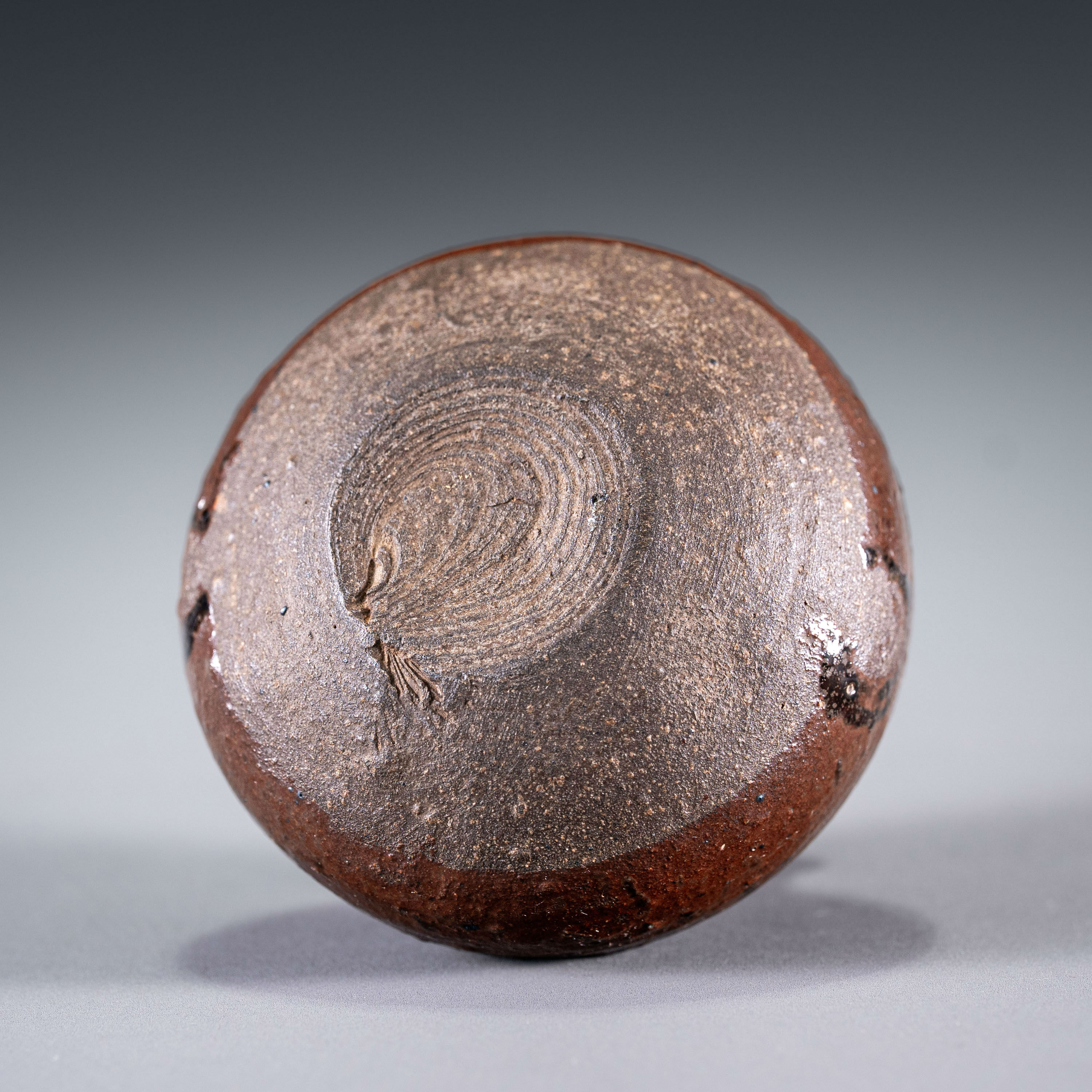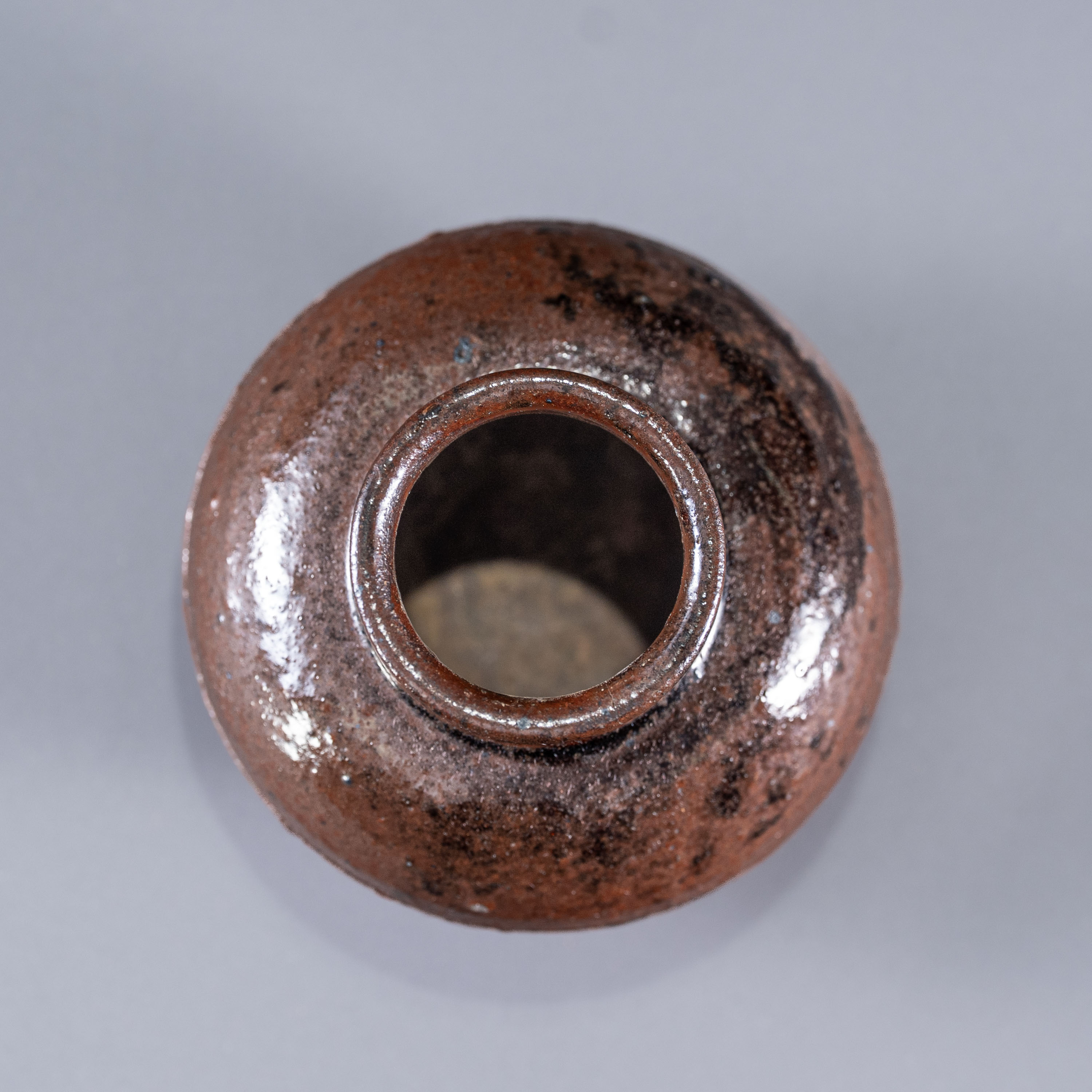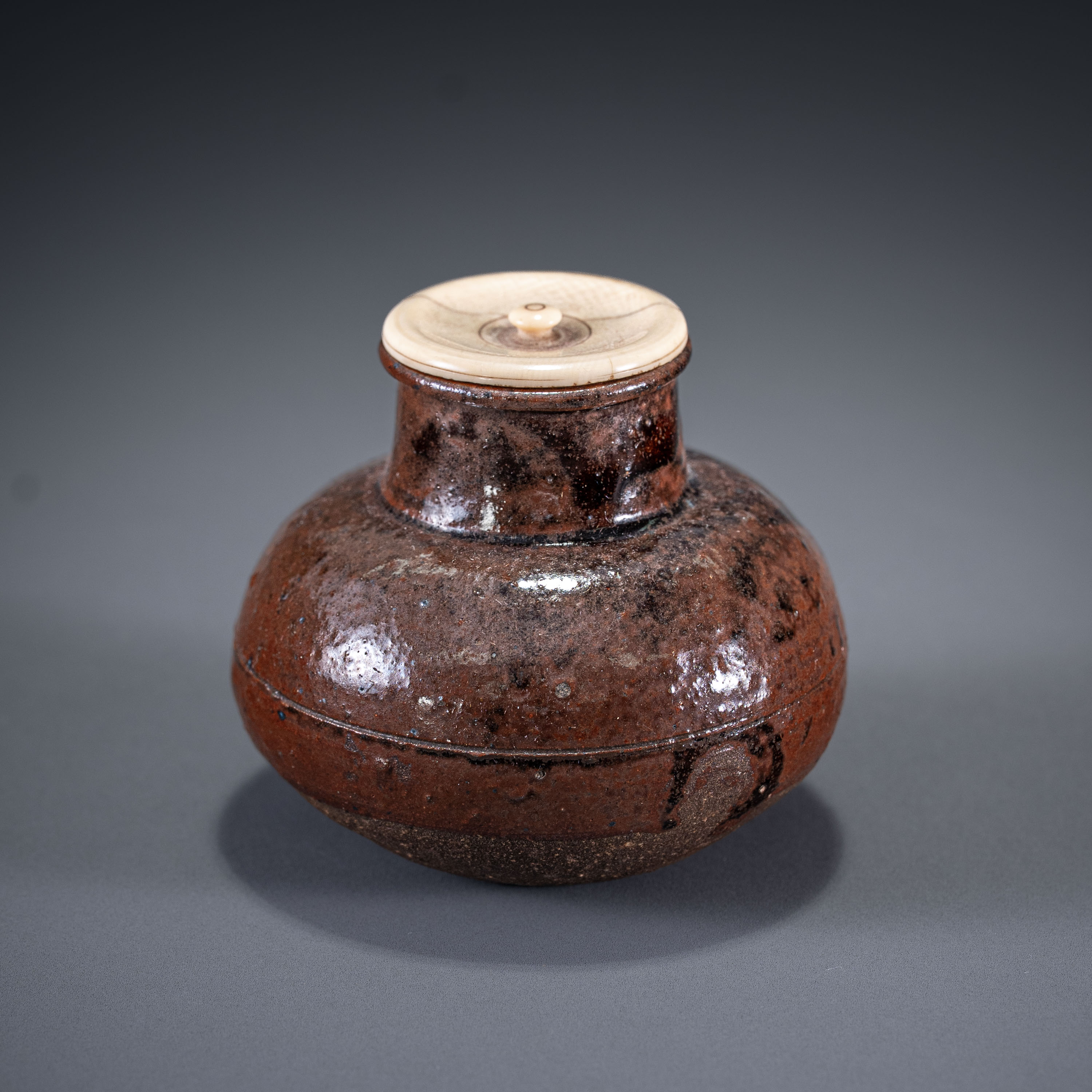 此件洪塘窑茶入,形制圆润饱满,重心下沉,呈现典型的“丸壶”样貌,是高规格唐物茶器的代表。器身通体施乌金釉,釉面极薄且莹润如玉,侧面一道横向弦纹不露声色地透出“侘寂”之美。底足修削利落干脆,展现出洪塘窑顶级且细腻的制瓷工艺,品相完好,殊为难得。
