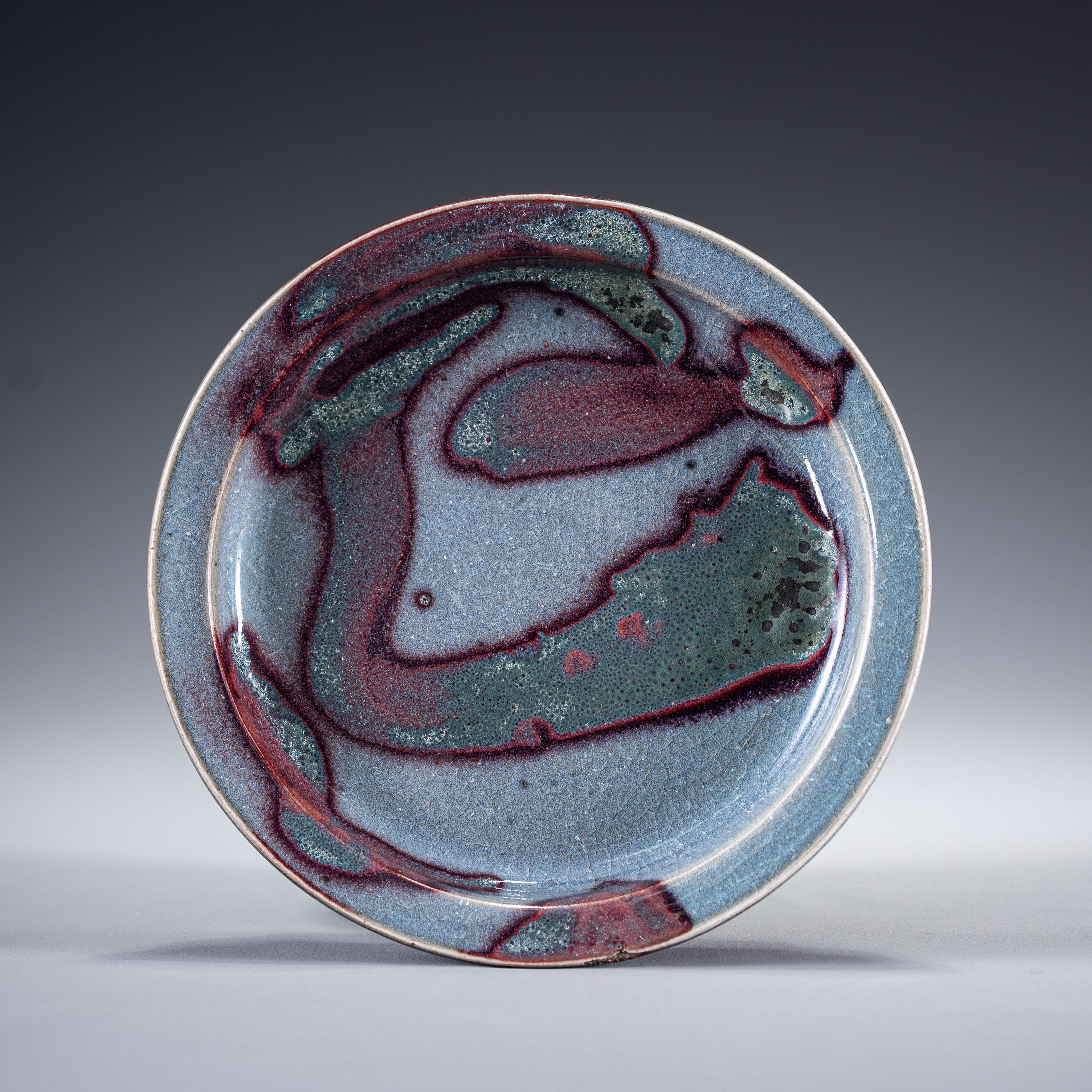 此盘形制端庄,折沿平阔,展现了宋金时期钧窑典型的雅致气韵。器身通体施天蓝色釉,釉质肥厚莹润。釉面上自然点缀有紫红色斑块,如泼墨般自然晕散。值得注意的是,盘面局部可见因窑火过旺而产生的深褐色红斑瑕疵,这种现象在钧窑烧造中被称为“窑变焦斑”。这种不规整的色块虽然在工艺上属于瑕疵,但它真实记录了千年前入窑烧制时的极端火候,为器物平添了一份沧桑与拙朴的自然美。