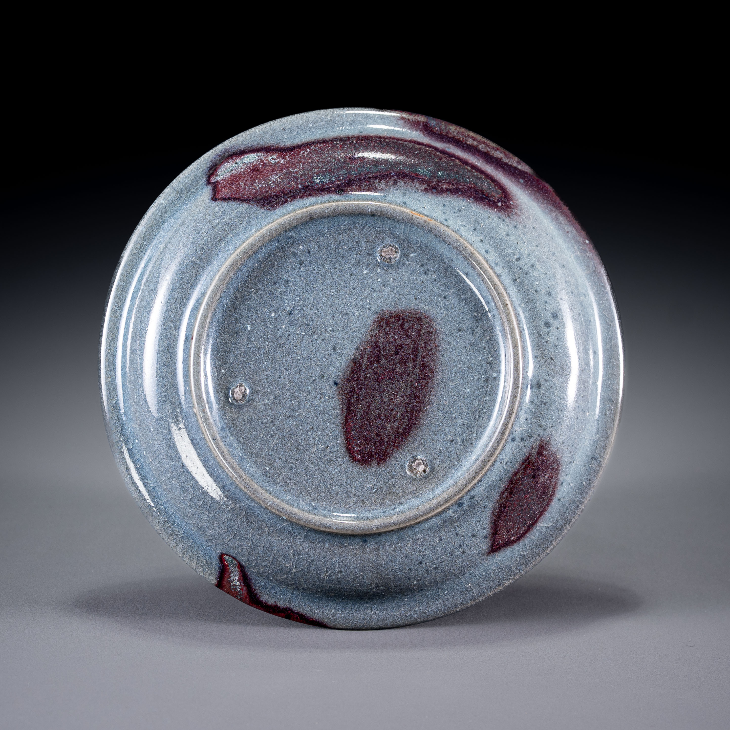在工艺特征上,此盘采用了“裹足支烧”的高级方式。翻转可见盘底满釉,并留有三枚清晰的支钉痕迹**,这保证了器物底部的整体感与釉面的完整性,是宋金时期高等级钧窑器物的典型做法。釉面密布自然的冰裂开片,与天蓝底色及深色窑变斑块相互映衬,视觉层次丰富。