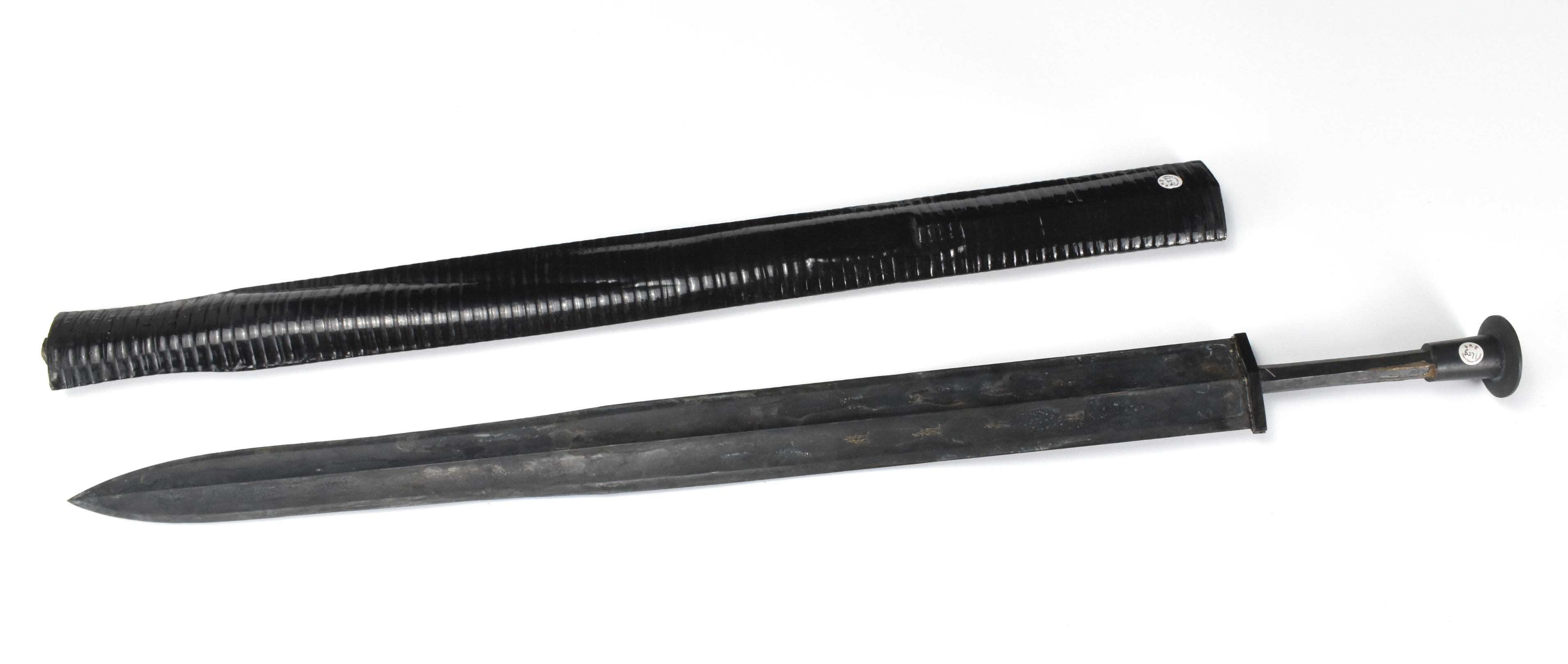 此件或为战国时期高古青铜剑及剑鞘。剑身两面中央起脊棱,两刃斜收形成锐利锋刃,聚为剑尖。剑身一面近格处错金八枚纹样化文字符号。柄作八棱形,配圆首。附一黑色髹漆剑鞘,饰凸棱纹。