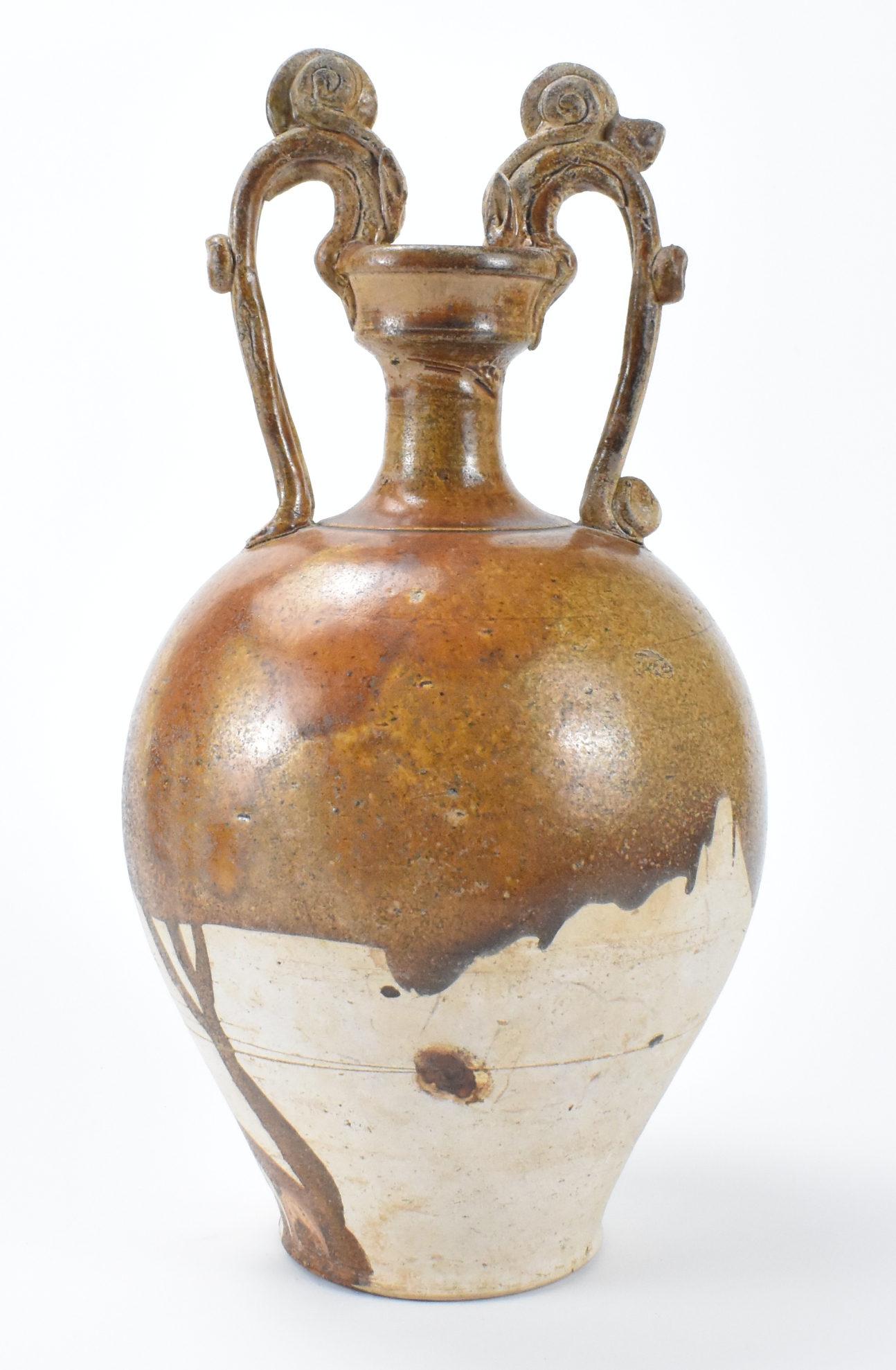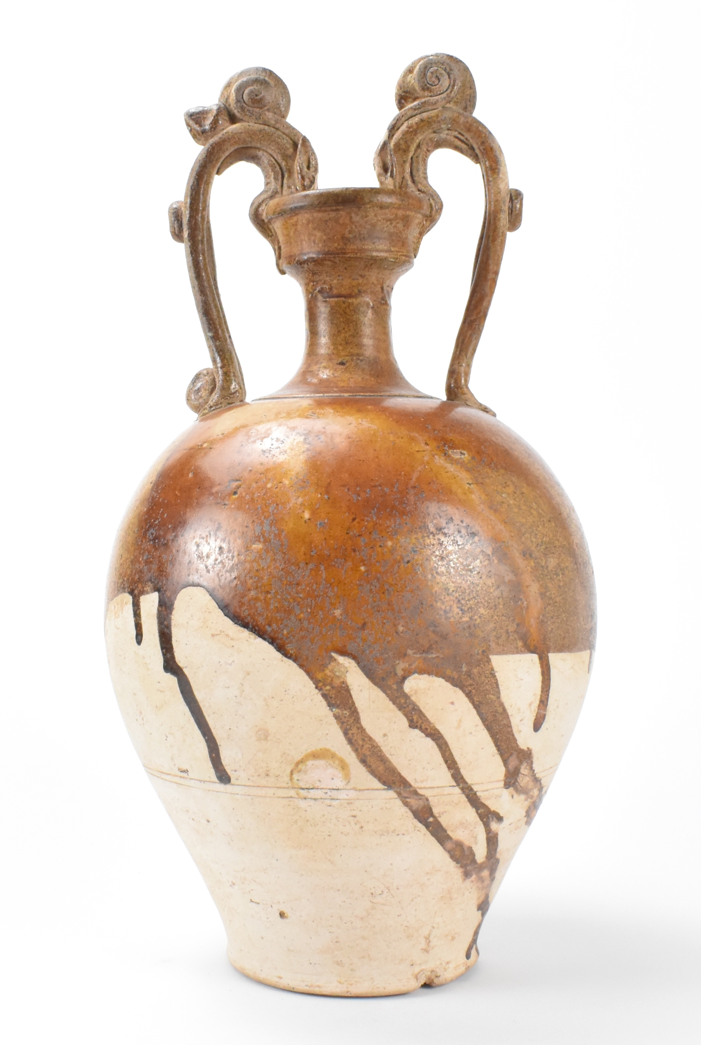 此件为唐代(618-907年)的草黄釉龙柄双耳瓶,造型优雅,为卵形腹,上接细束颈,一对弯曲的双条带形柄上贴塑乳钉,末端为相向龙首,衔住杯形口沿。器身自口沿至高圆肩以下通施草黄釉,釉在细腻的粉褐色胎体上止于一道不规则边线。下承平足,足边斜削。