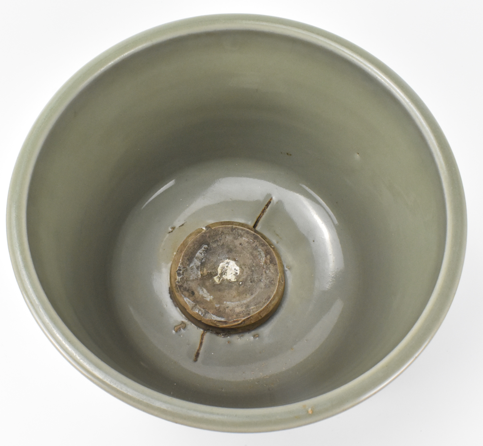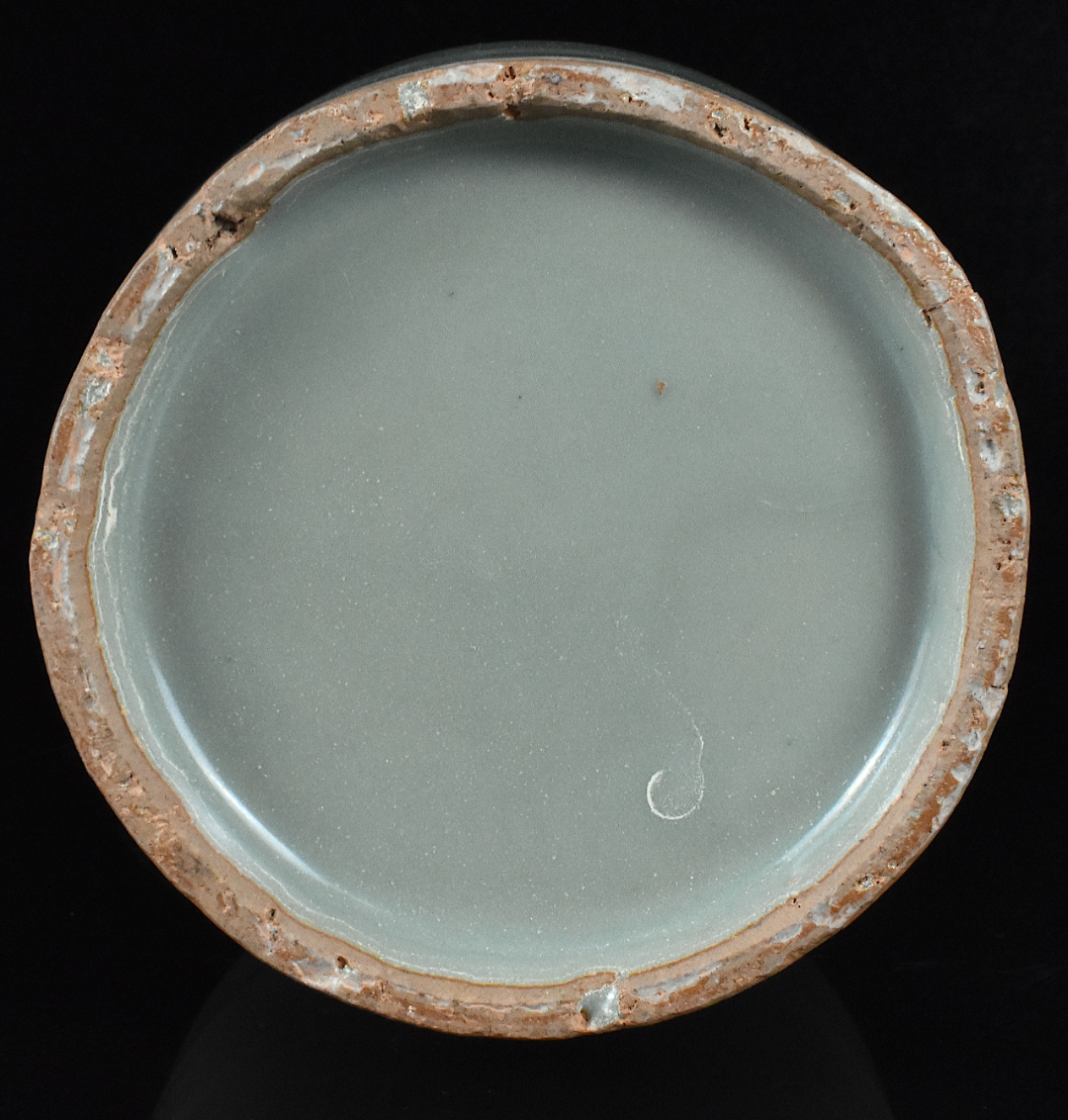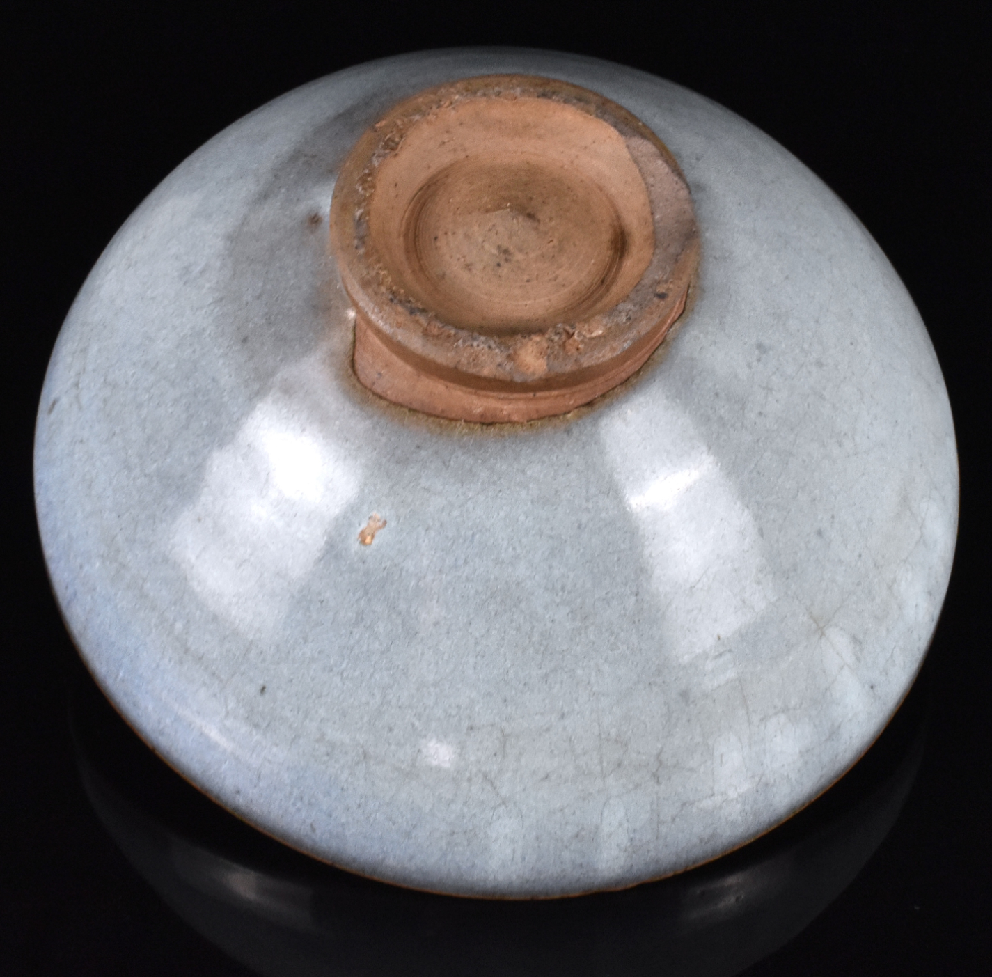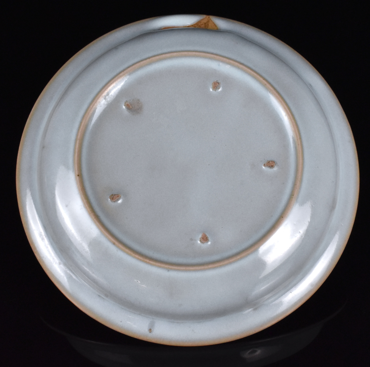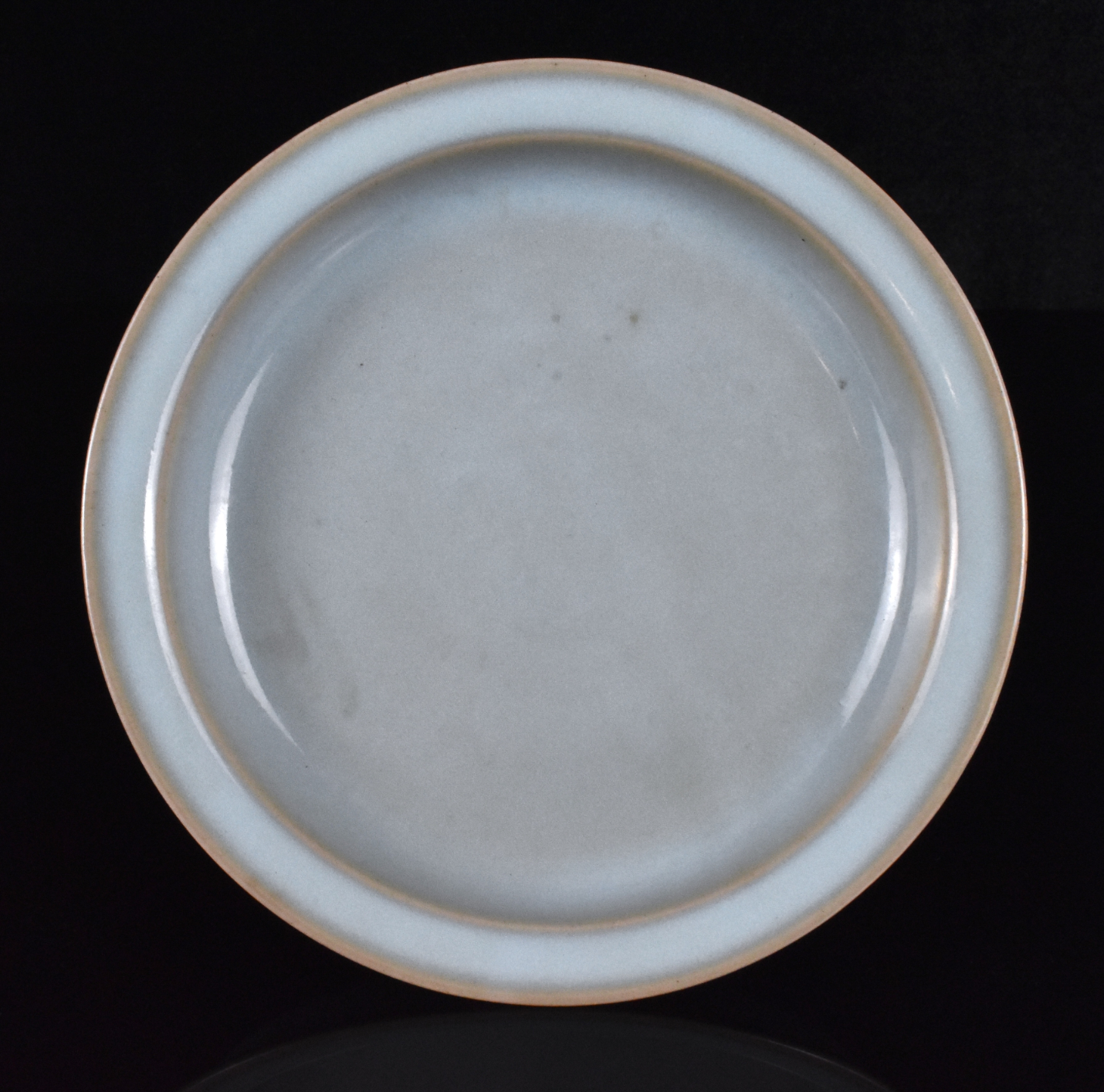 胎体厚重,浅腹圆壁,下承短锥足,接宽阔外撇口沿。通体施乳浊状天青釉,釉至口沿处渐薄呈蘑菇色。盘心内凹处满釉,可见五枚支钉痕。