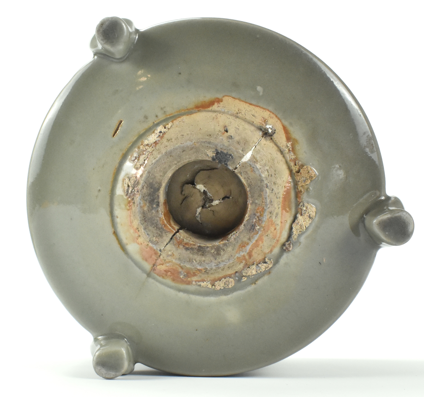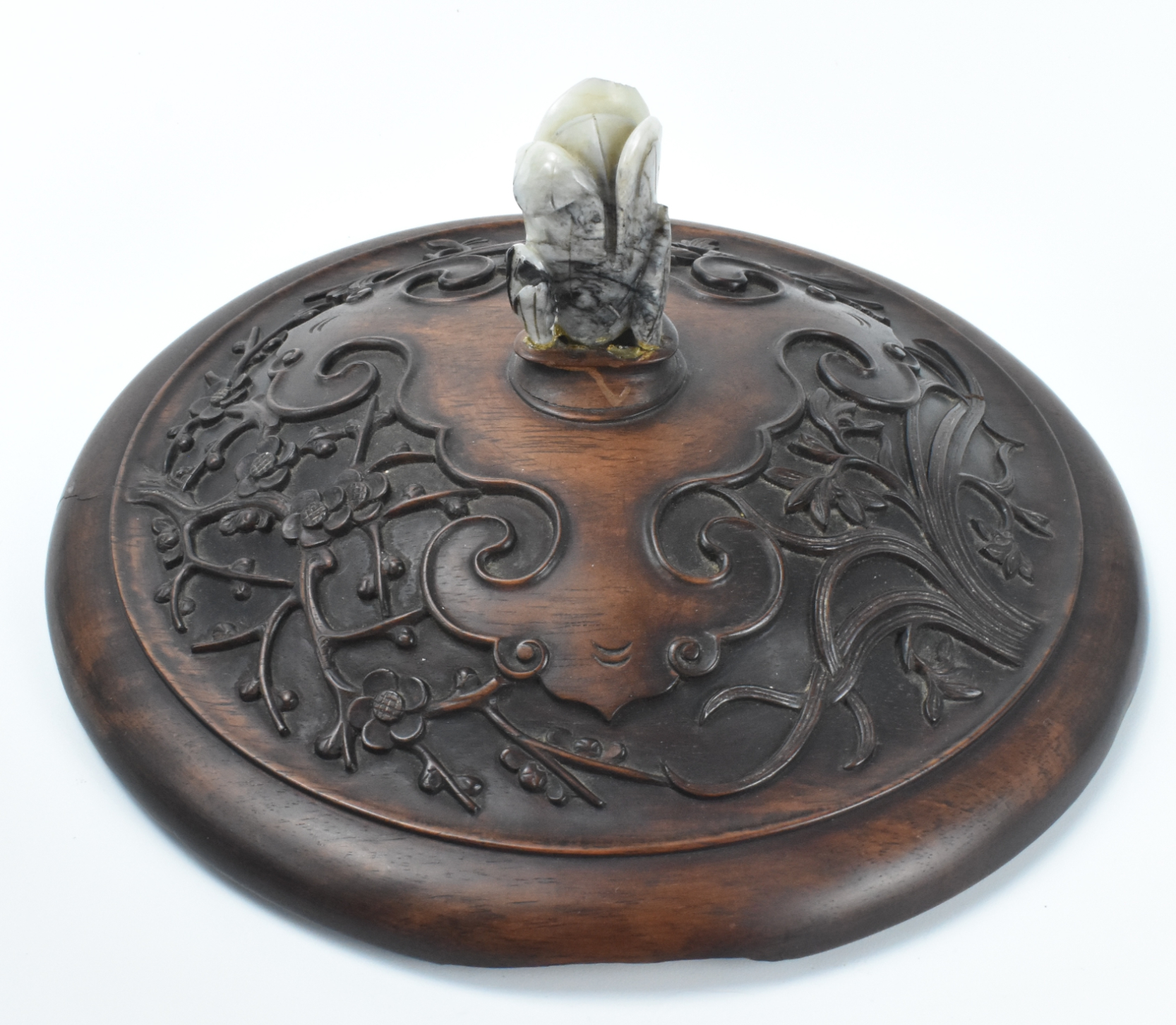 此件为明代的中国龙泉青瓷香炉,炉身为矮筒形,中央饰一周宽阔的模印缠枝牡丹纹带,上下以窄弦纹相隔。平口沿略起浅槽。下承三只兽形足。弧底中央开有一圆孔。通体施厚润的橄榄绿色青釉。配木盖,盖面雕刻三组花卉纹,顶饰乳白灰色玉质花形钮。