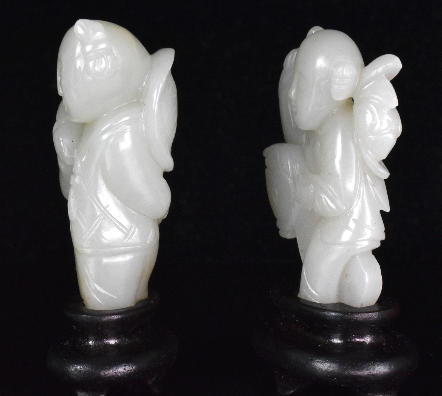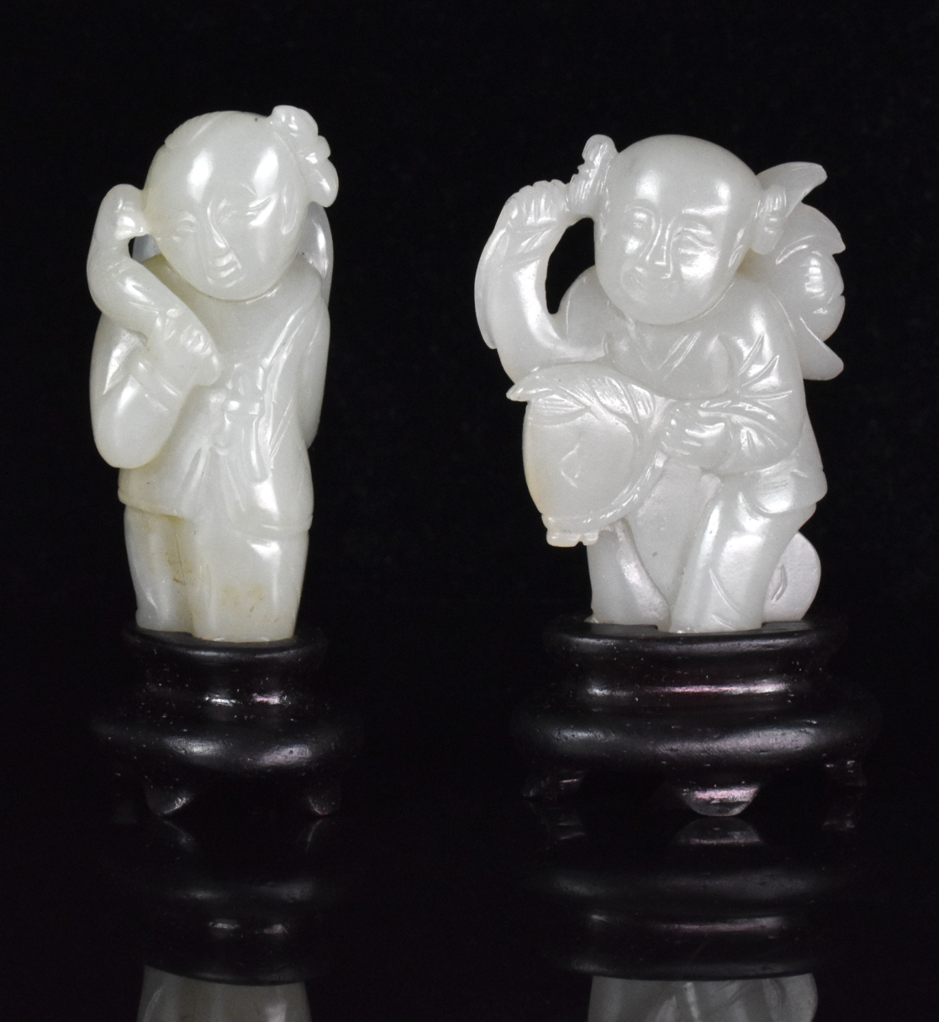 两件十八至十九世纪的中国玉雕童子像,每件童子均雕作站立姿态,右手肩负一柄莲花。各配有一小型随形木座。
