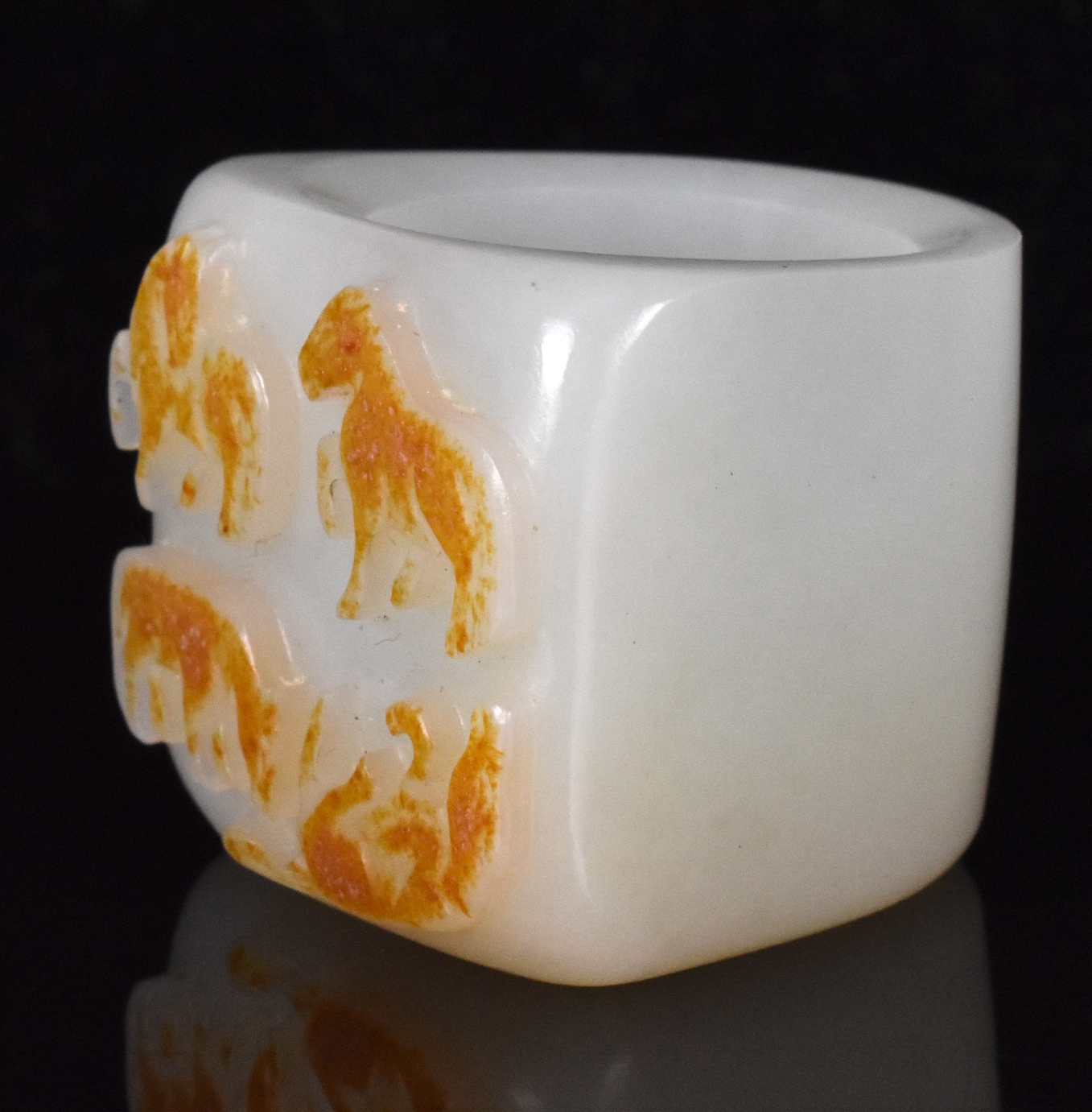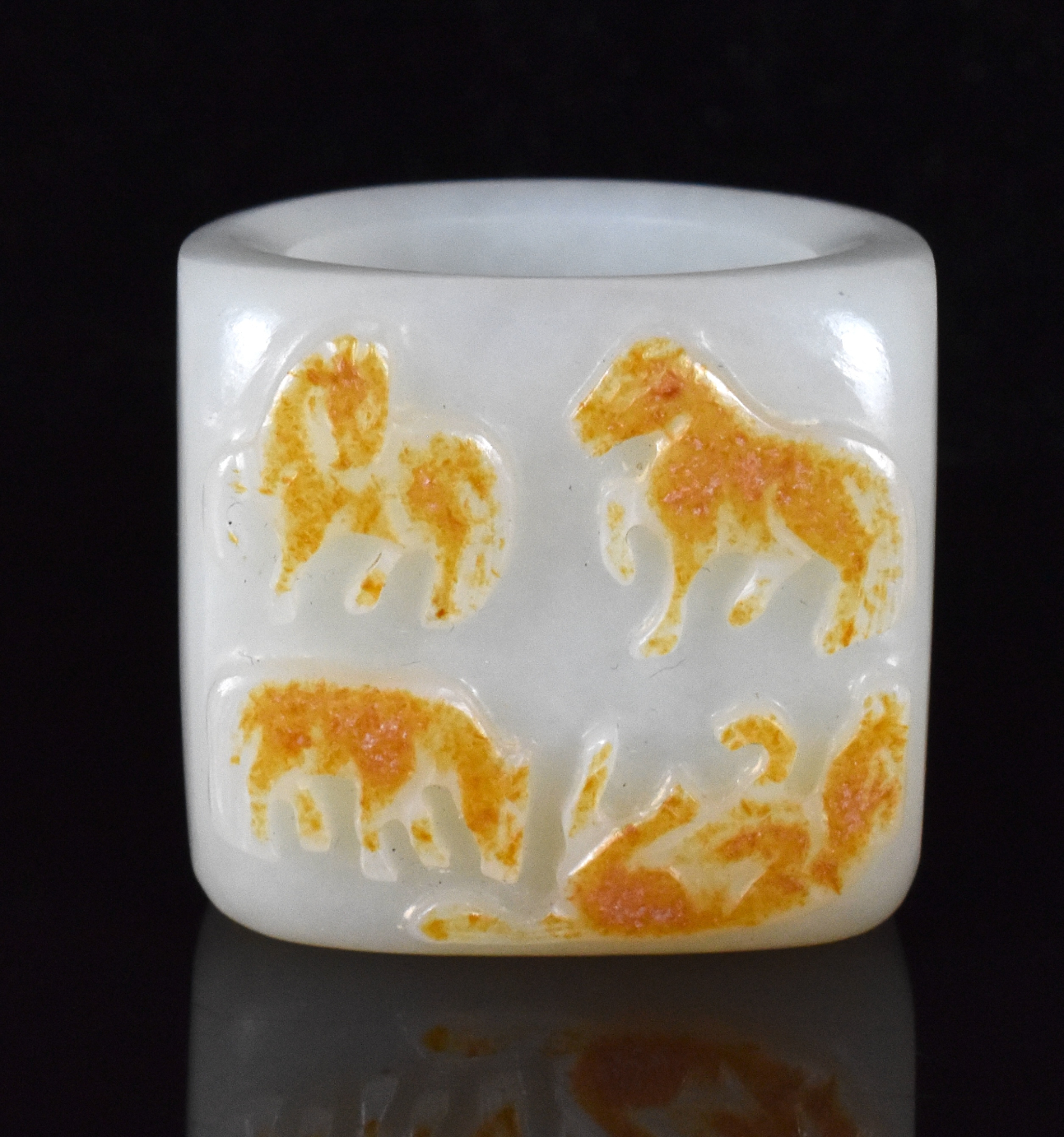 此件中国玉雕带马纹扳指,时代约为十八世纪。扳指侧面雕琢光滑,顶面平坦,饰有四匹姿态各异的骏马纹,玉料带有洒金色。