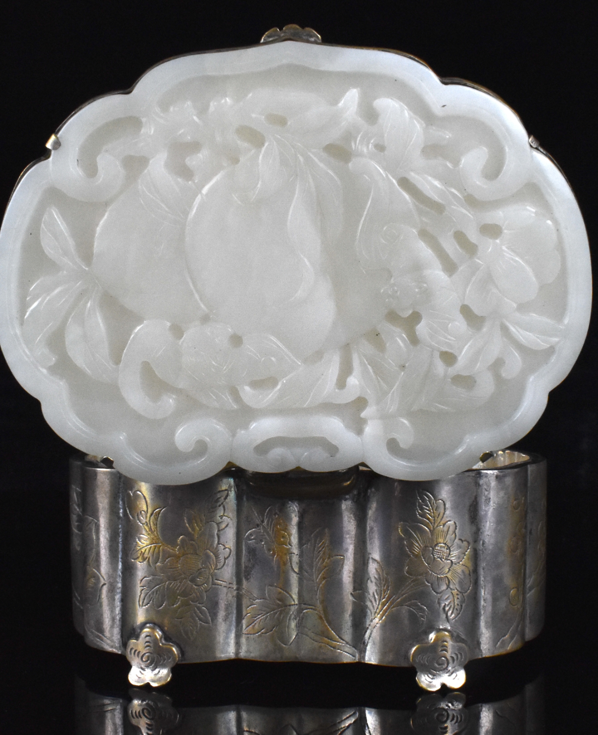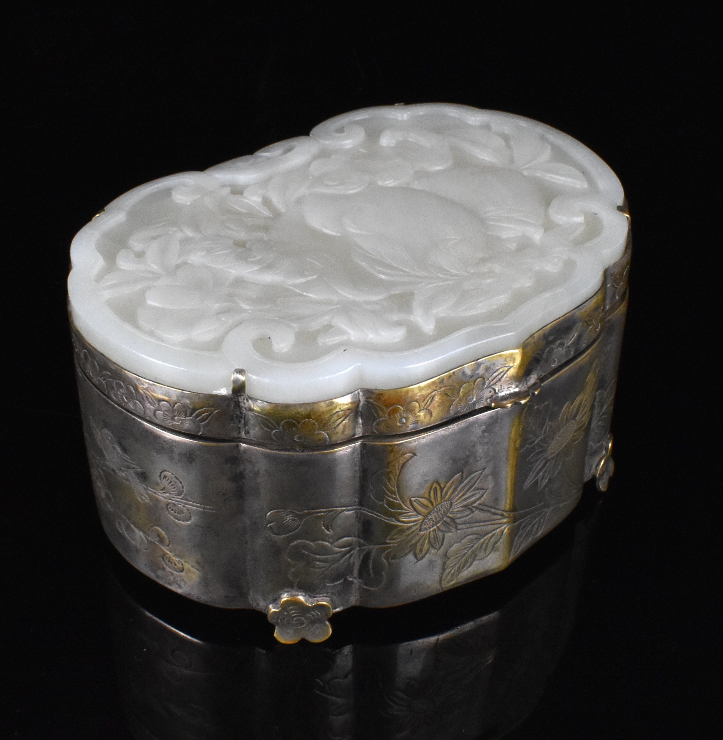 清 银胎嵌白玉蝠寿桃纹银盒