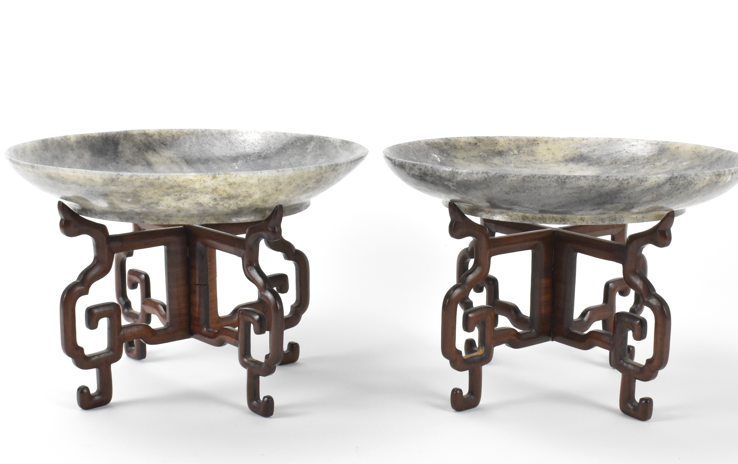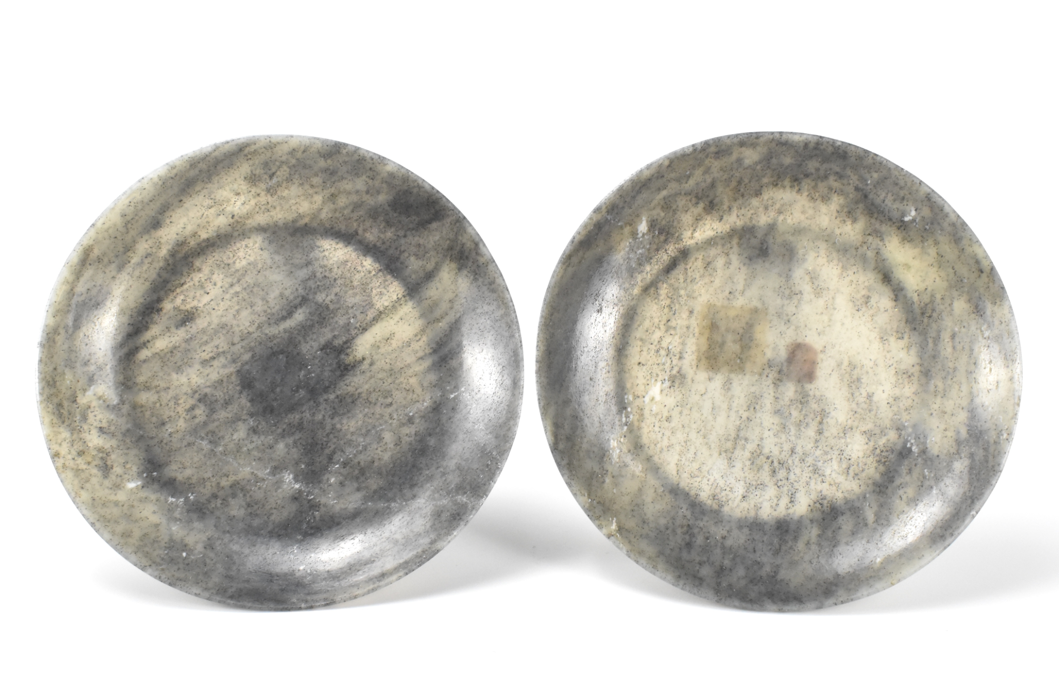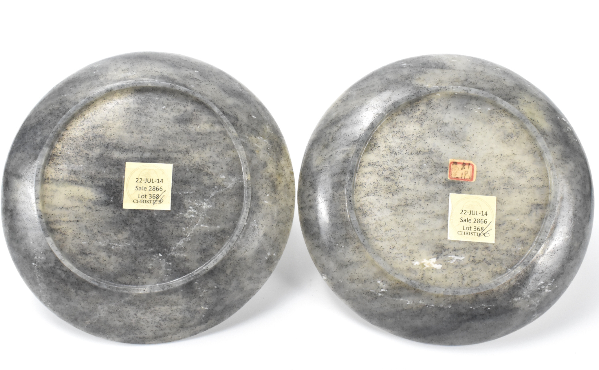 一对中国玉雕浅盘连木座,时代约为十八/十九世纪。玉质呈青灰色与黑色,盘沿微起。置于定制木座之上。附佳士得2014年7月22日拍卖标签,场次2866,拍品号368。