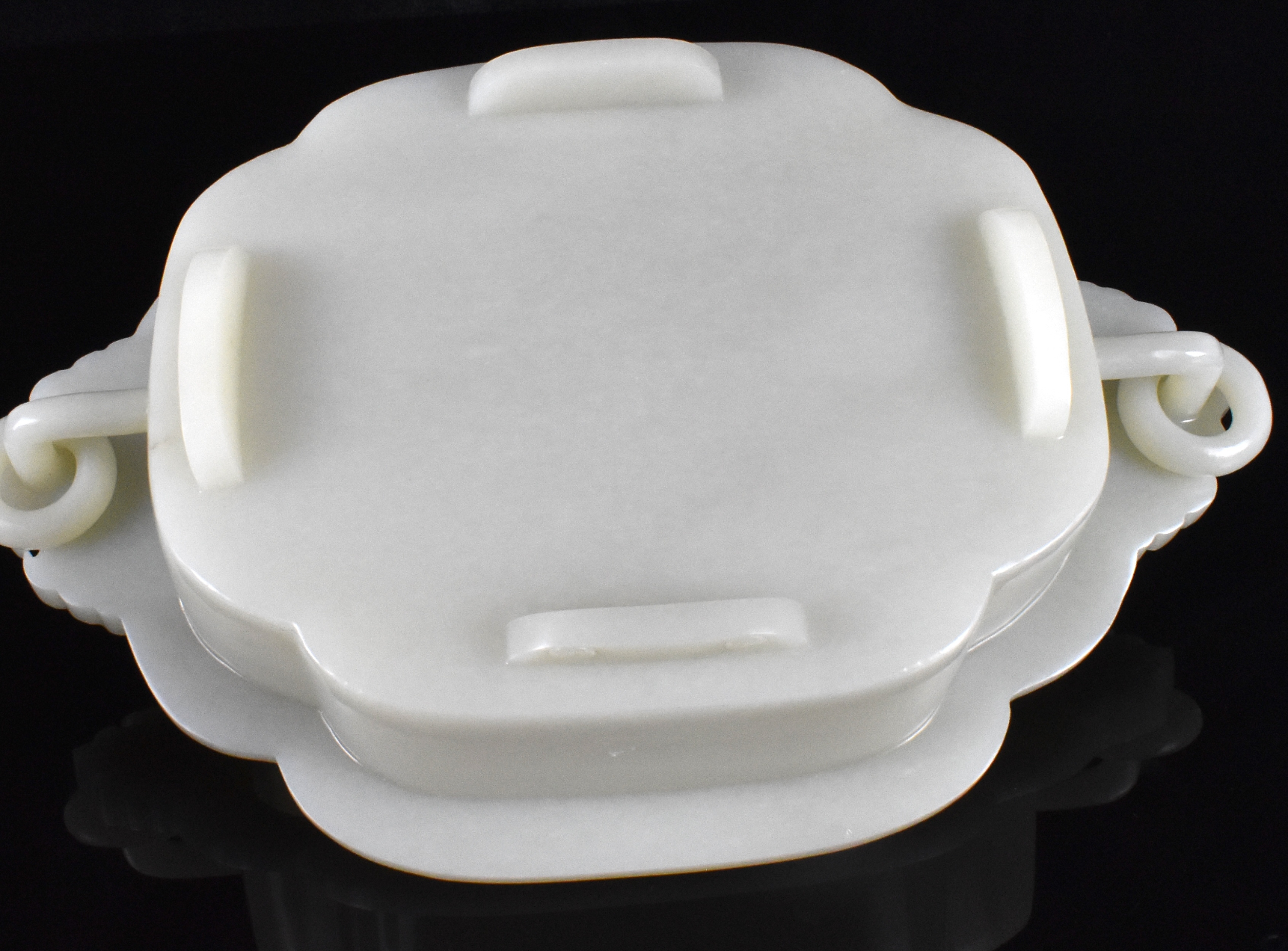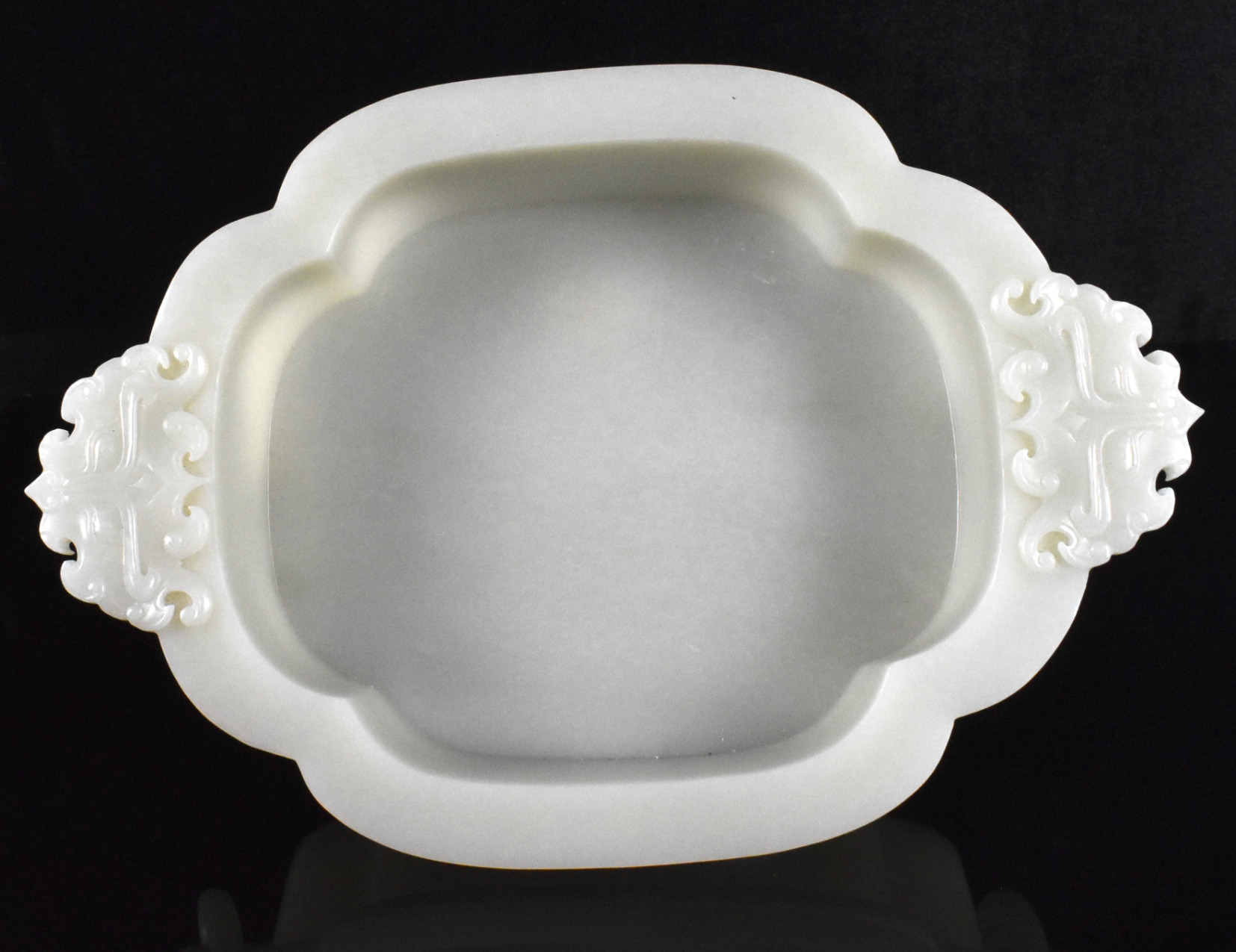 此件中国玉雕多瓣花盆连座,呈椭圆形状,圆弧形盆壁分为四瓣。下承四只如意足,上接与外壁相应形状的外撇口沿。盆身两侧各设一饕餮纹耳,并悬有玉环。置于一定制雕刻高木座之上,木座雕刻有蝙蝠形开光及如意云头纹饰。