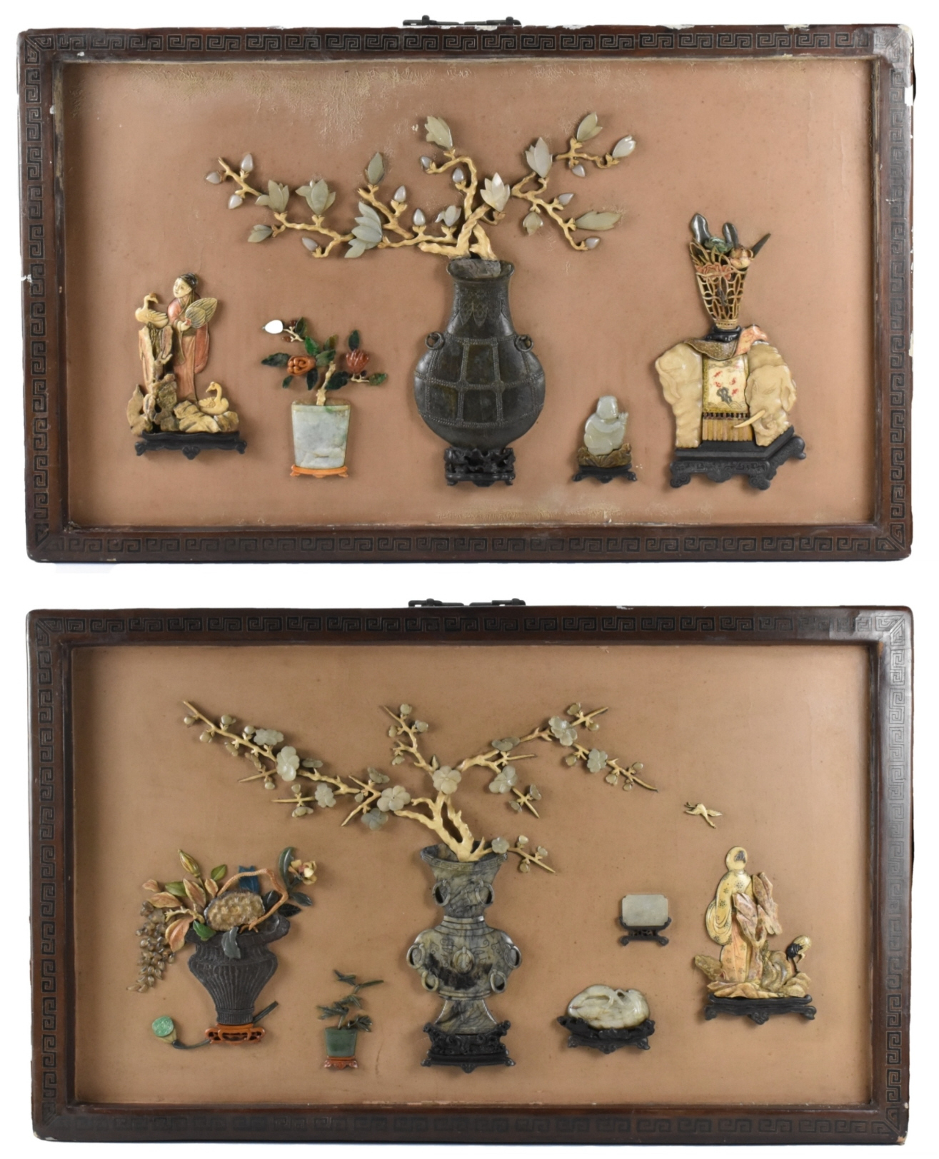 此为十八世纪的一对中国嵌玉石及宝石挂屏。挂屏以饰有雷纹的鎏金漆木框装裱,屏心以多种玉石及宝石镶嵌,构成一幅博古图:中央为一大型古瓶插花,四周环绕花篮、大象、仙鹤、花盆、人物、瑞兽等纹样。所用材质包括玉、翡翠、滑石、玛瑙等。