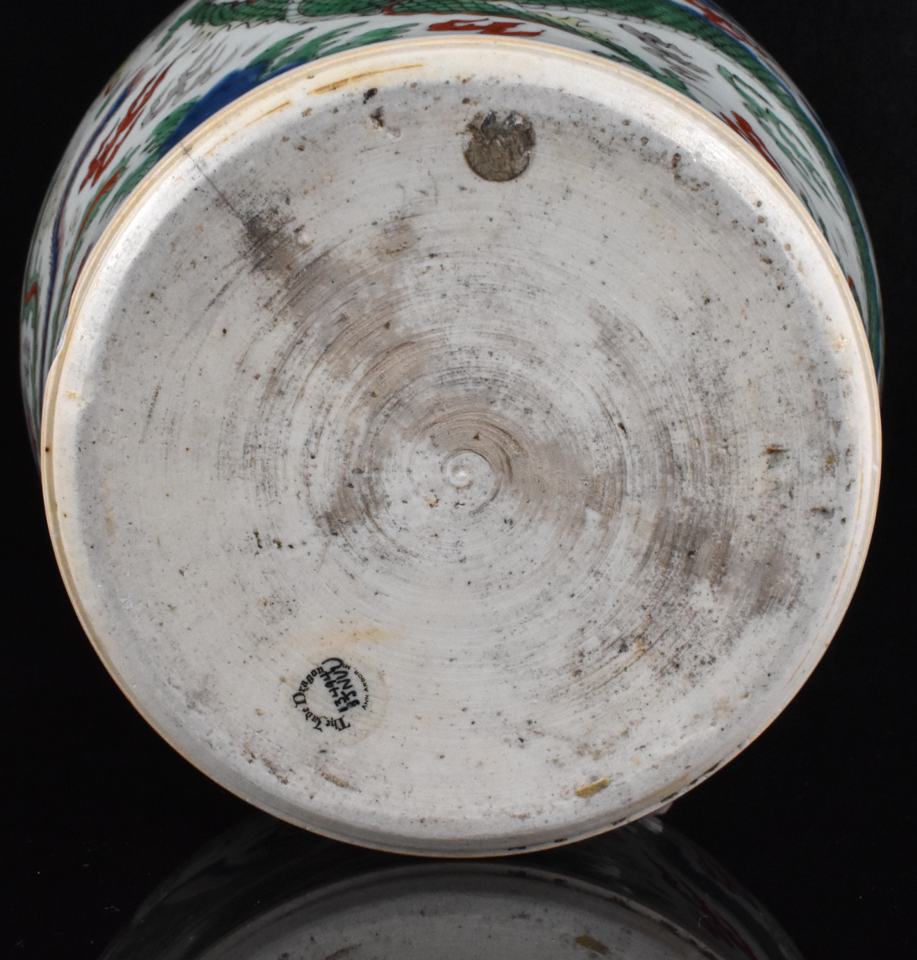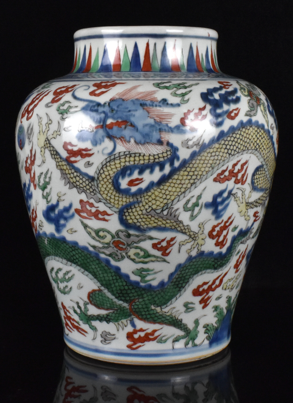 此为十七世纪的一件中国五彩龙纹罐,罐身为高肩卵形。外壁以鲜艳彩釉装饰一对黄绿蛟龙,于翻腾的红海与翠绿浪涛之上追逐一颗火珠,四周环绕红绿两色的火焰与祥云。肩部饰有釉下蓝彩冰裂纹,颈部饰直立莲瓣纹。罐底无釉。