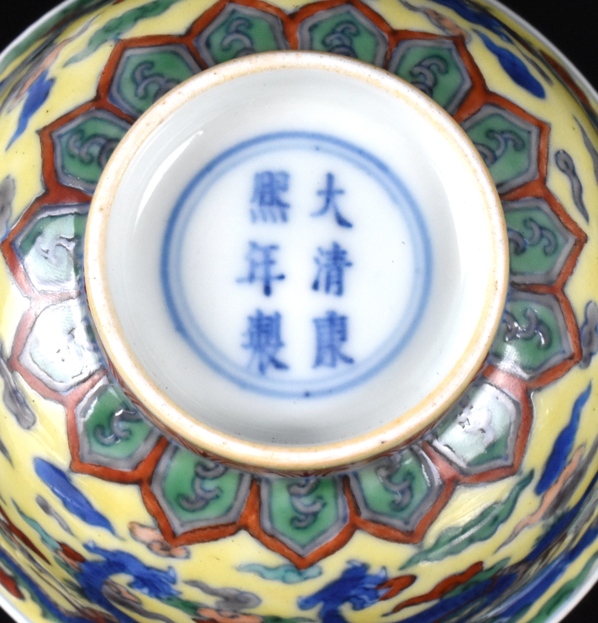 此为康熙时期(1662-1722)的一件黄地五彩龙纹碗。碗内施白釉,外壁于黄地上饰一对生动的蓝龙,于五彩祥云间追逐一颗火珠。碗心青花双圈内书六字本朝楷书款。
