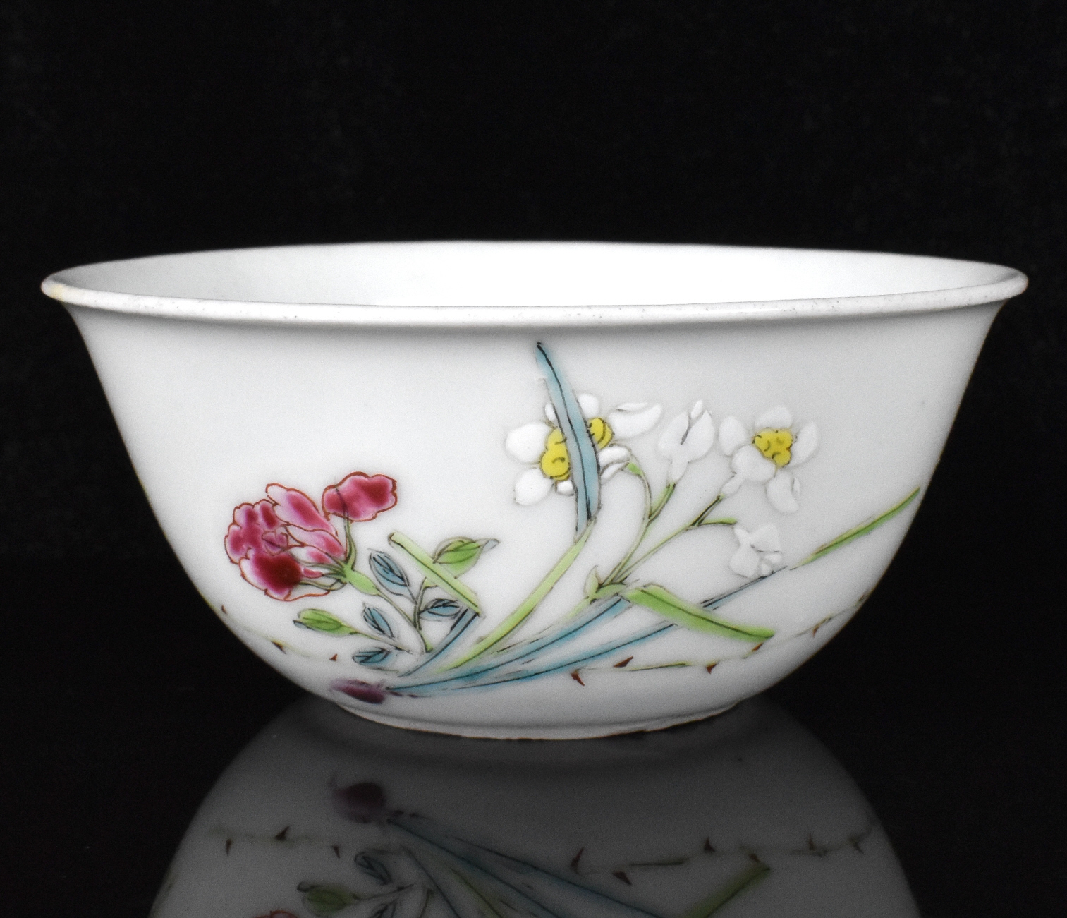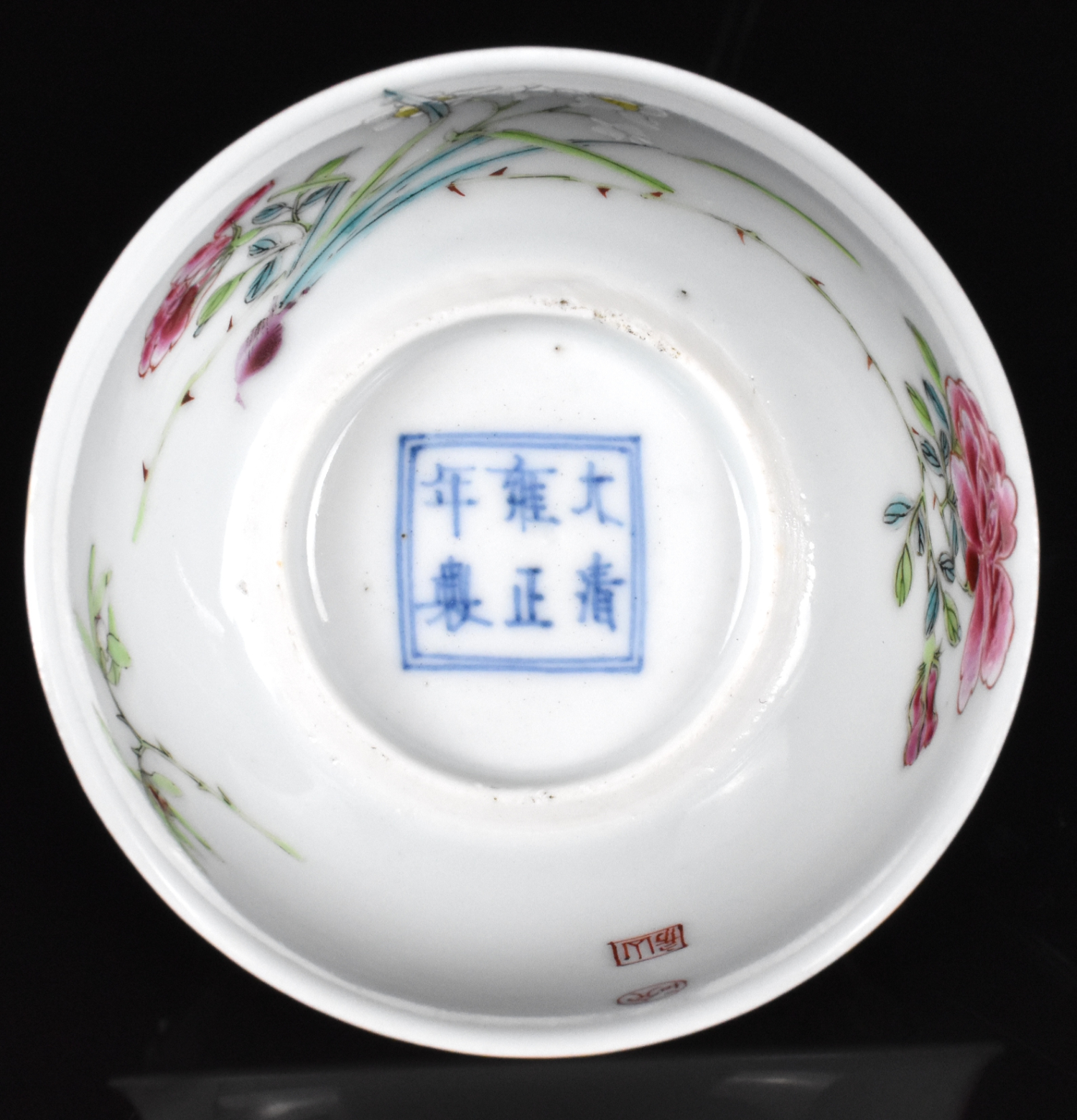 此为雍正时期(1723-1735)的一件粉彩花卉杯。杯内施白釉,外壁以细腻笔触绘红牡丹与白花,衬以绿叶。卧足内青花双框书六字雍正款。