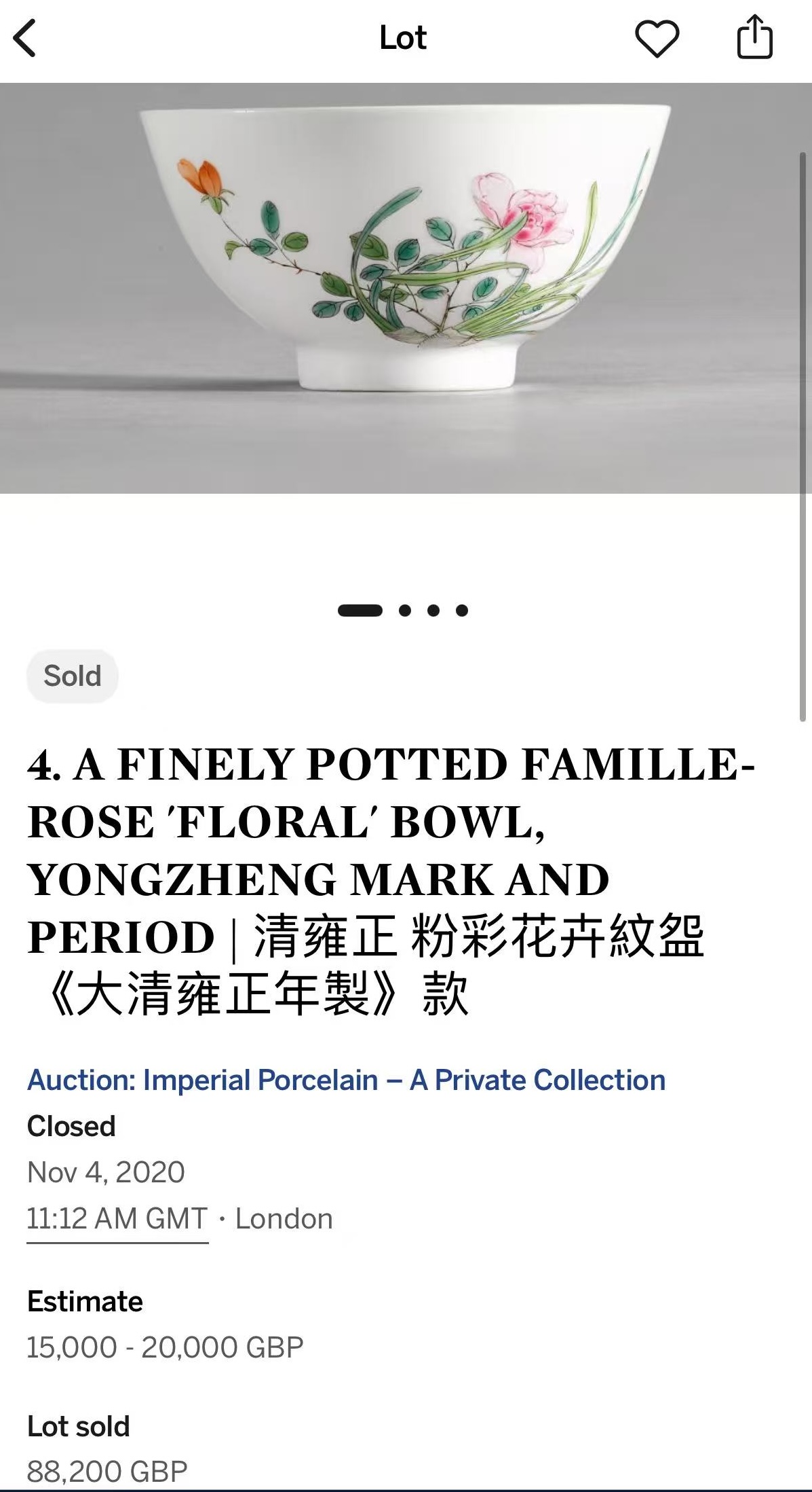 参考:一件类似的雍正时期花卉杯曾于2020年11月4日在伦敦苏富比拍卖行“帝瓷一一私人珍藏”专场中拍出,拍品编号4,成交价为88,200英镑。