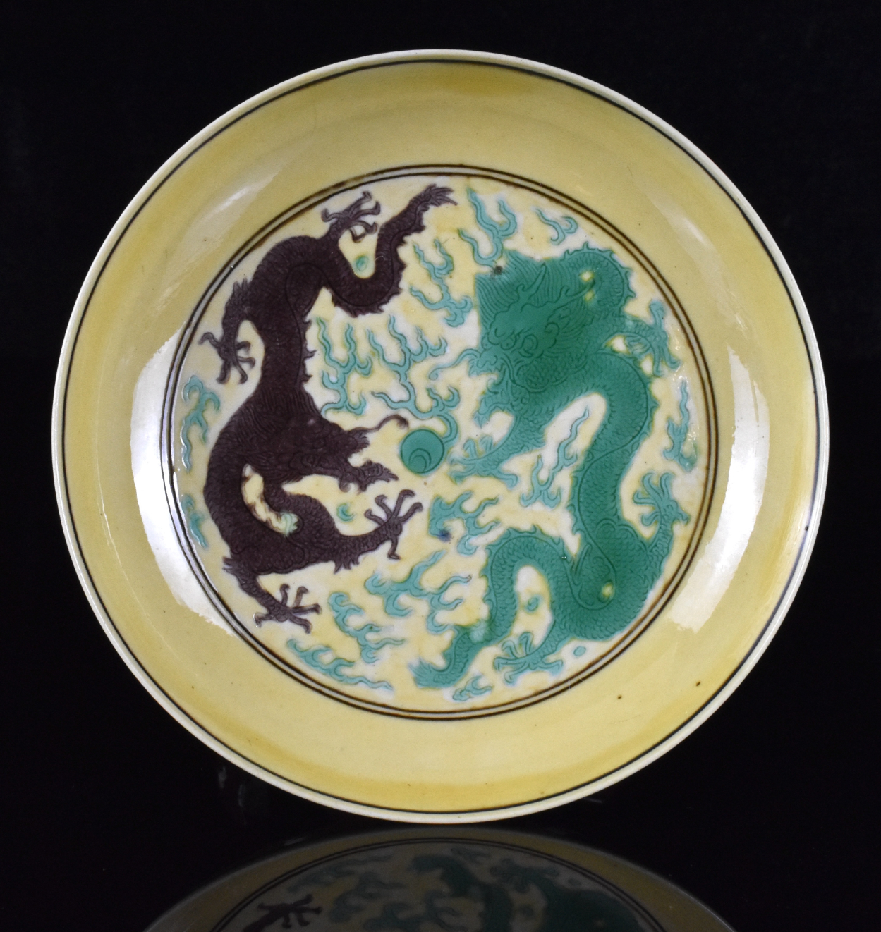 清 黄地绿紫彩云龙纹盘