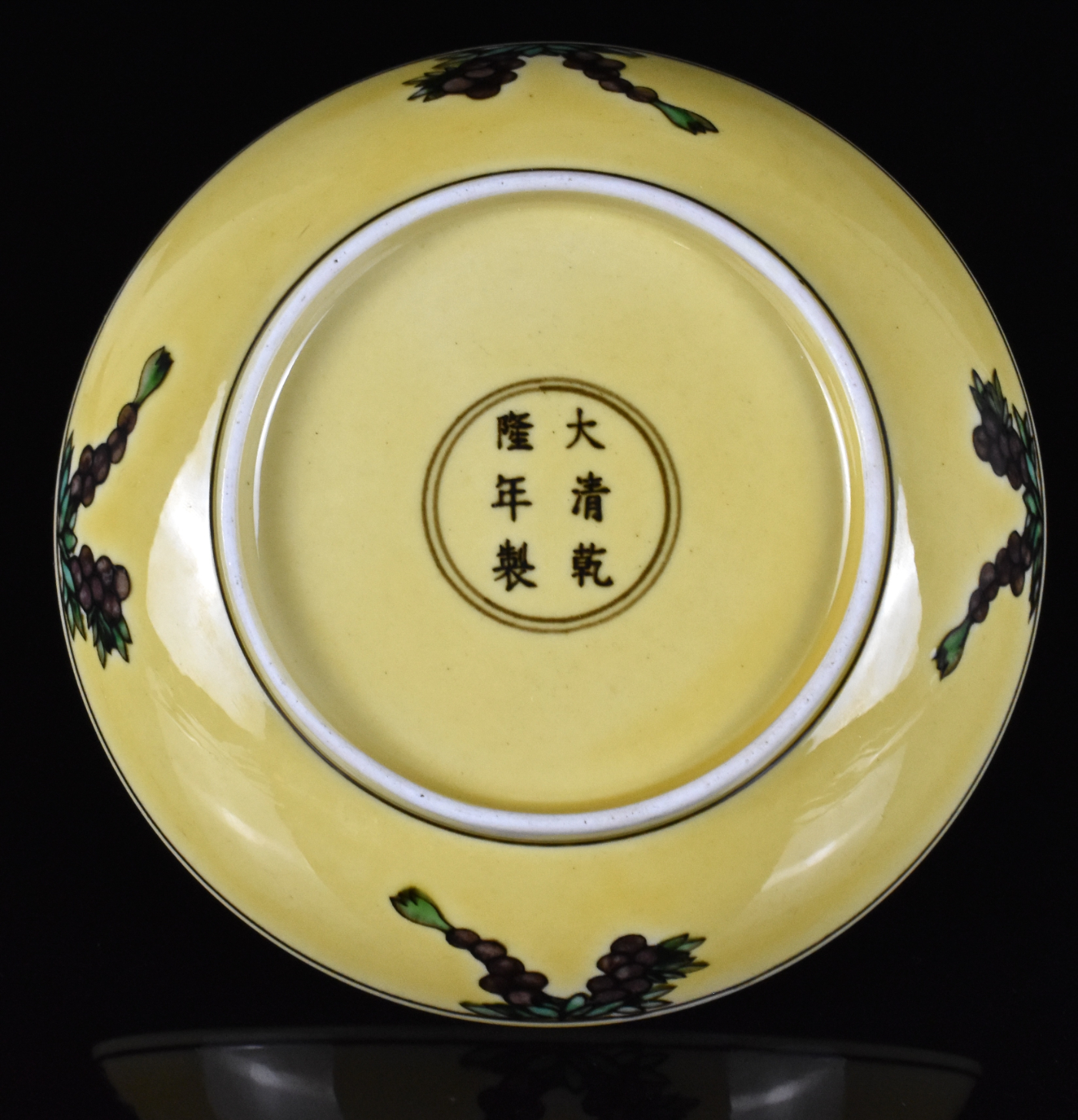 此为十八世纪的一件中国黄地绿紫彩龙纹盘。盘心以绿、紫两彩绘一龙戏珠纹,四周饰绿色云纹。外壁绘四组折枝花果纹。全器绘于黄地之上,盘底青花双圈内书六字楷书款。