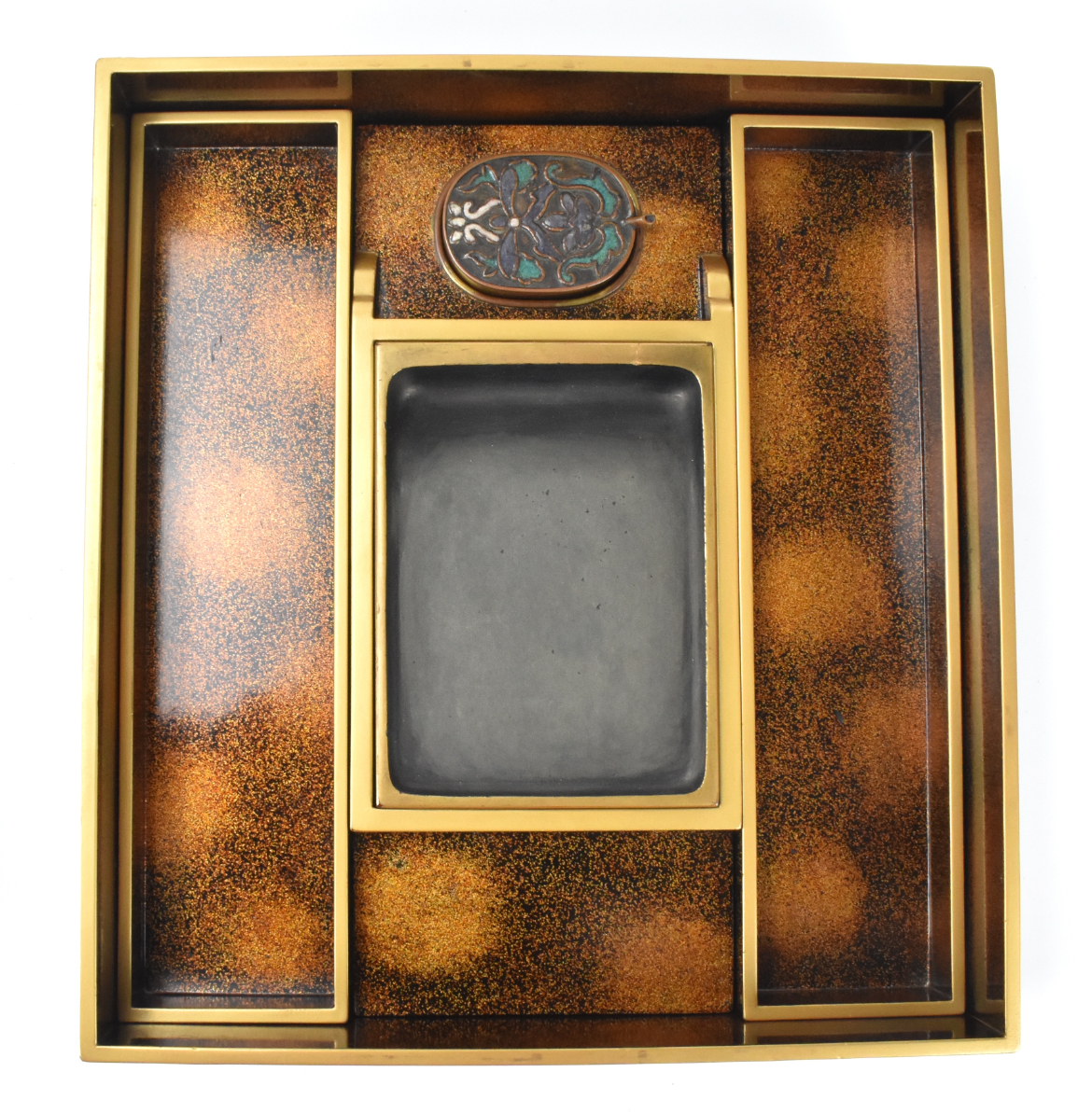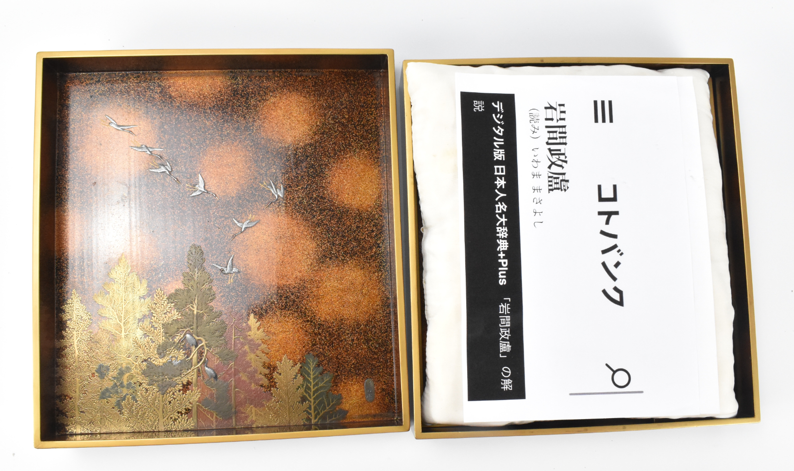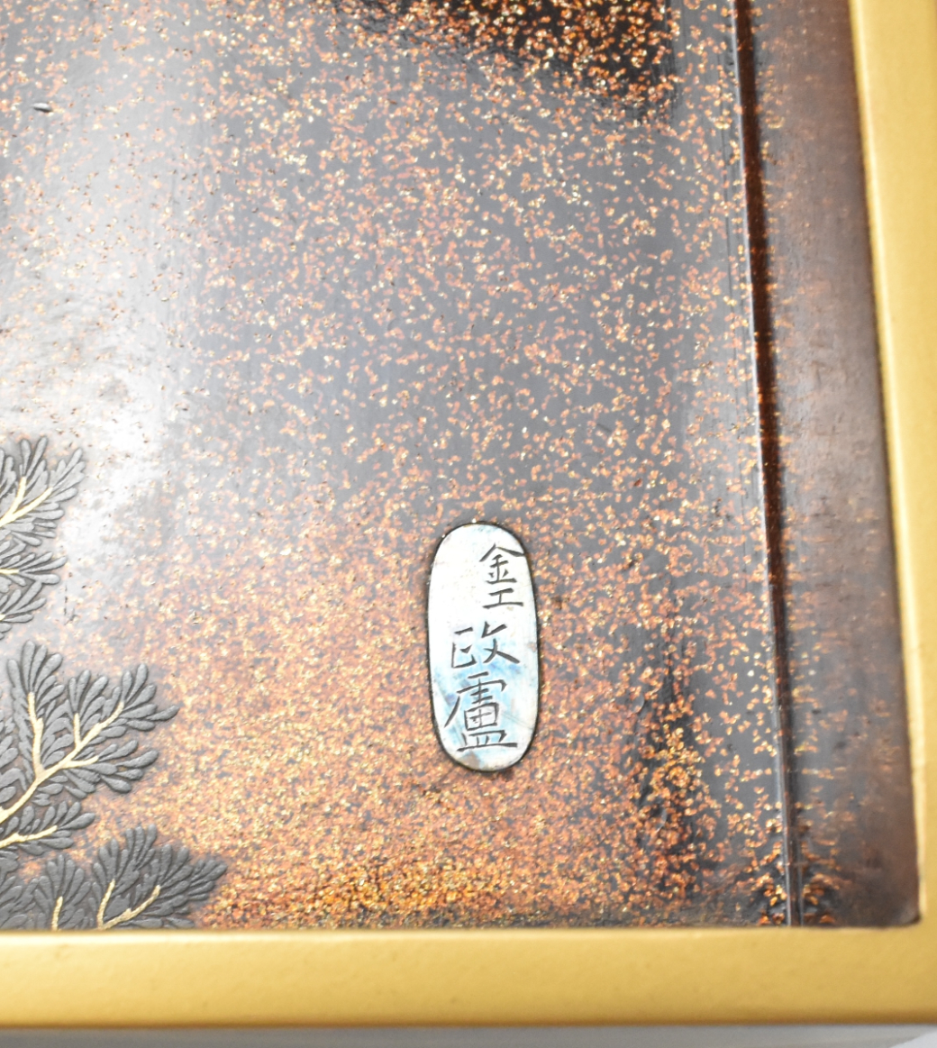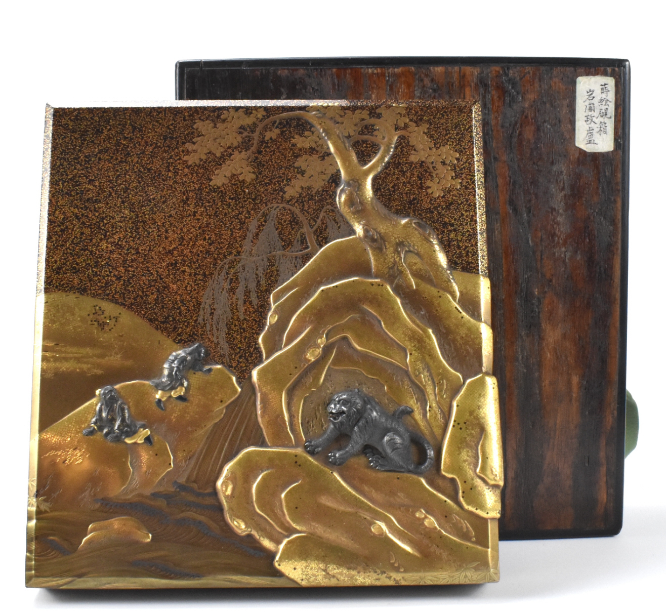 此为明治时期的一件日本银镶嵌漆器砚盒,由工匠“Iwama Seiro”制作。此盒华美,漆盖之上以银镶嵌技法描绘一只猛虎与两位人物,置身于金色山石景致之中,一株巨松从石间生长。盒内设有一方砚台与一个装饰性水盂,以及其他分隔区间。盒盖内侧描绘一群银雁飞越林间的景象。此砚盒历来保存于一个坚固的定制木盒之中。