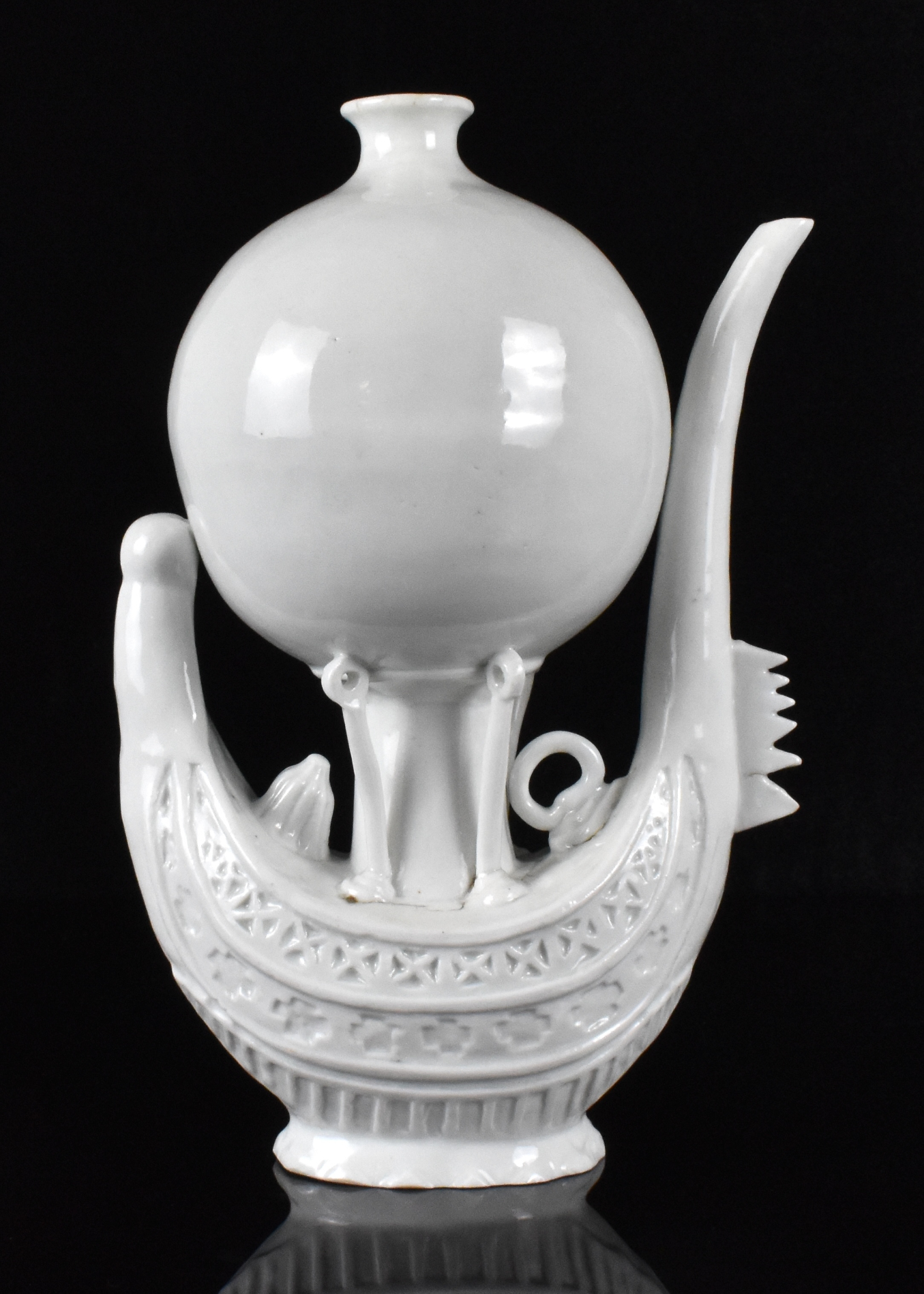 此为十八世纪晚期的一件中国德化窑“蒙戈尔菲耶热气球”形执壶。造型巧妙,塑造成一个系有吊篮的热气球。吊篮船首翘起弯曲形成壶流,船尾内卷形成壶把。整体置于一个镂空的海浪形底座之上,通体施德化白釉。