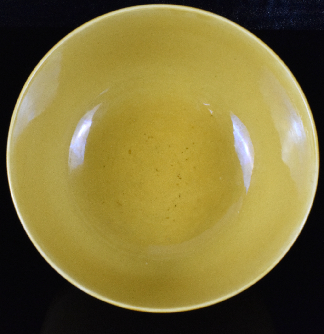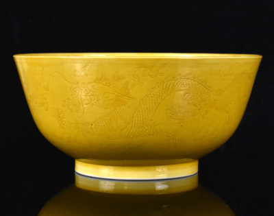 此为光绪时期(1875-1908)的一件中国黄釉龙纹碗。深腹圆壁碗通体施光滑黄釉,外壁刻划一对蛟龙,于海浪云纹间追逐一颗火珠。白釉底上书青花六字本朝楷书款。