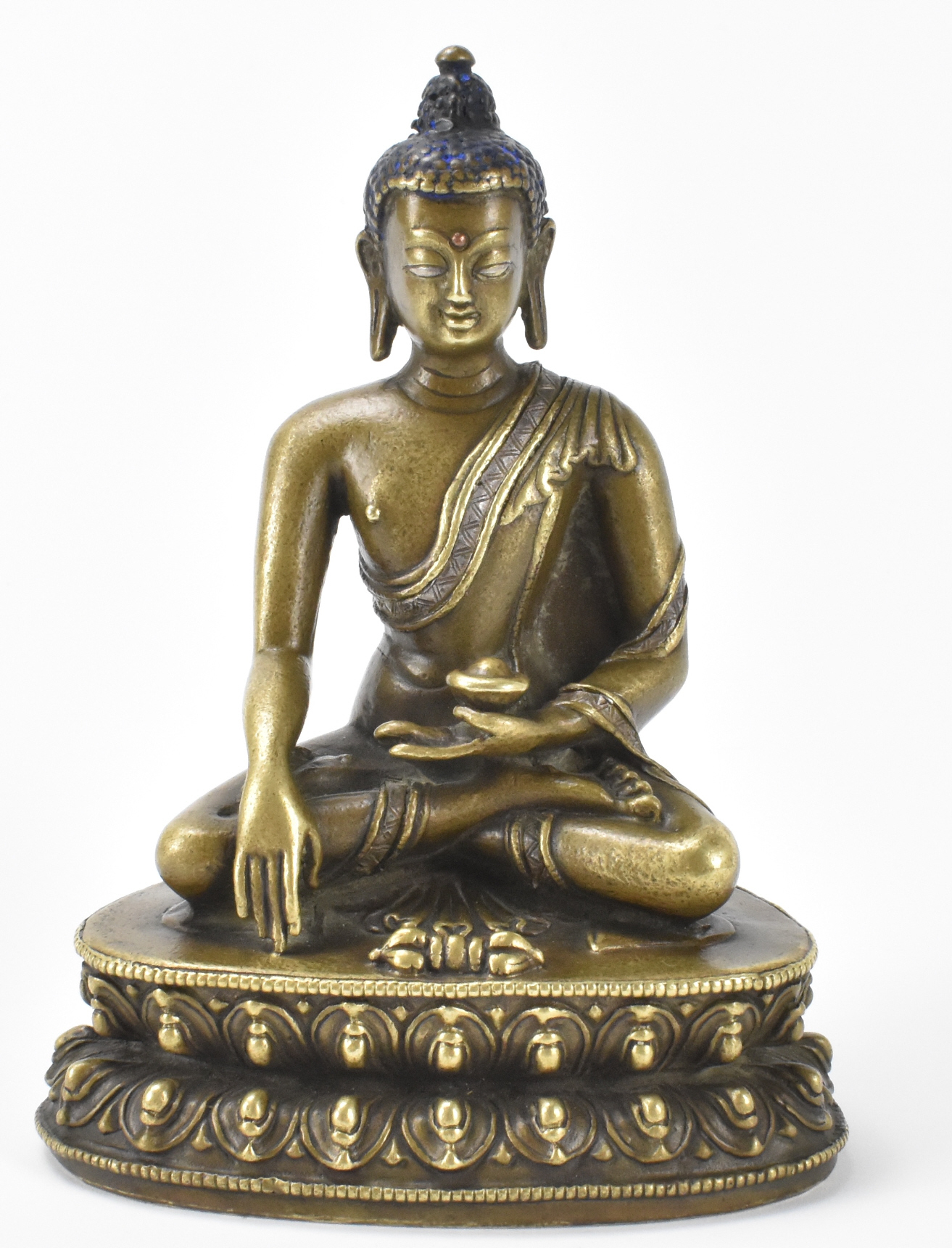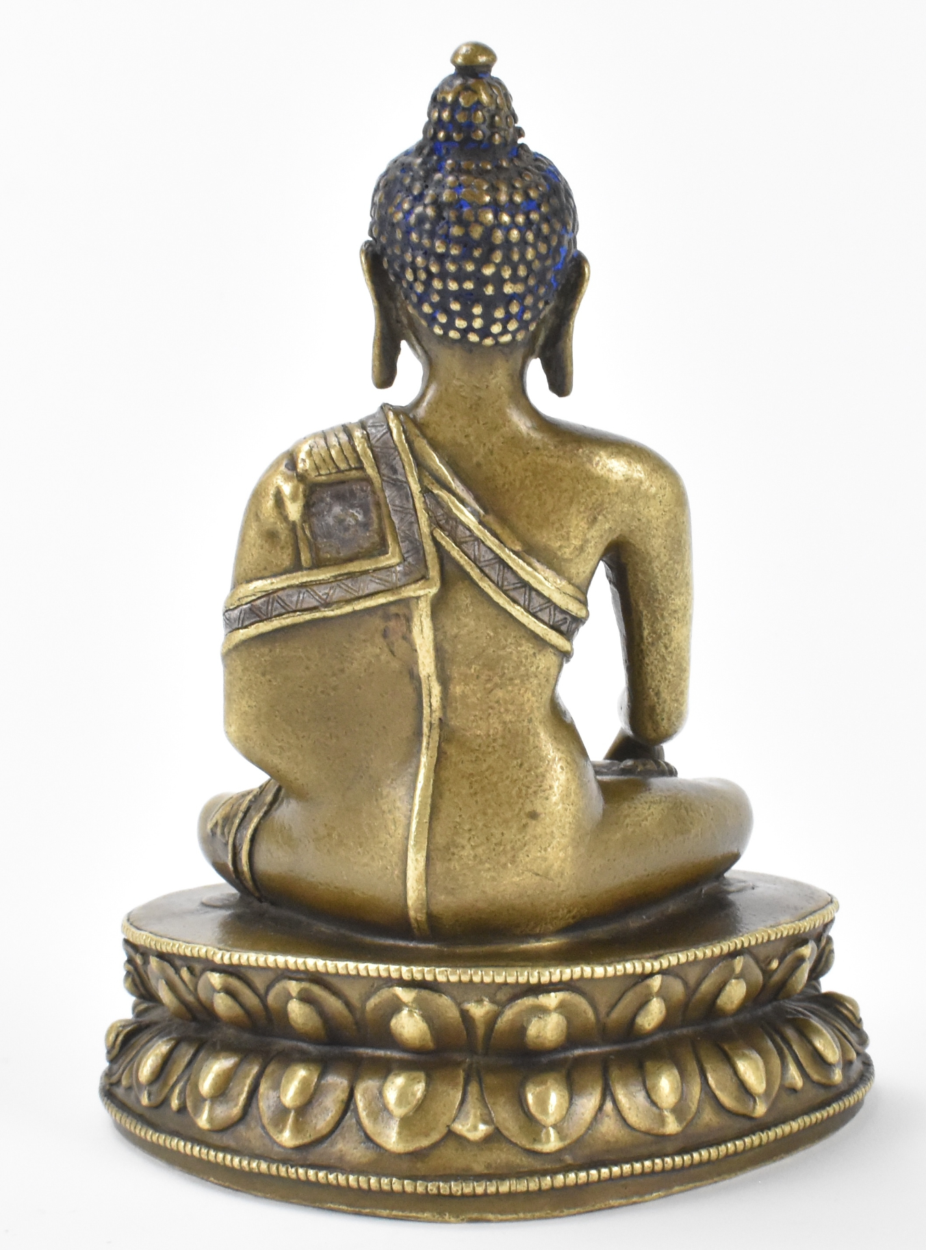 此为十五/十六世纪的一尊西藏铜银镶嵌黄铜佛像。尊像结金刚跏趺坐于双层莲座之上,座前饰一金刚杵。右手结触地印,左手结禅定印,左掌心托一吉祥法器。面庞俊秀,呈冥想神情,双眸嵌银。身着覆肩袈裟,衣缘周身以银嵌饰带纹。底部封藏。