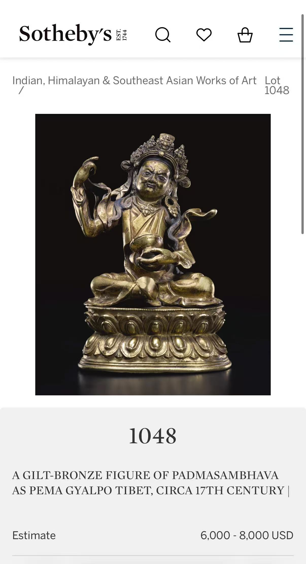 来源:香港 Yan Wing Arts Co.,1991-1995年;纽约苏富比,2018年3月22日,“印度、喜马拉雅及东南亚艺术品”专场,第1048号拍品。