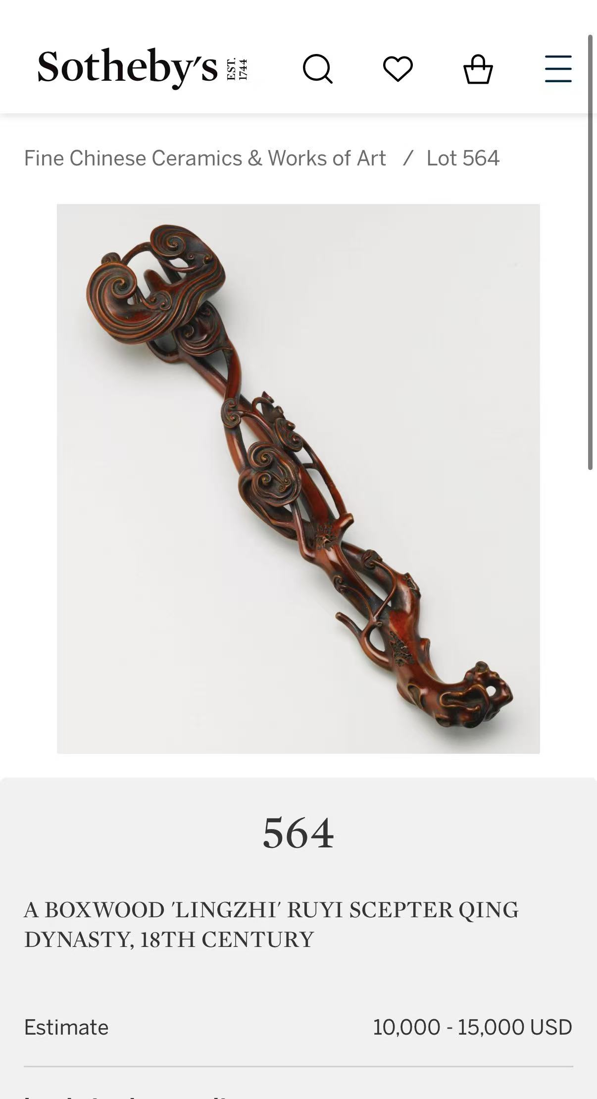 此为十八世纪的一件中国黄杨木雕灵芝如意。采用立体圆雕技法,造型写实自然。如意柄部虬曲多节,饰以镂空雕刻,间有仿古磨损痕迹,并衍生出小灵芝丛形成手柄。首部呈不规则多层状,雕刻为一只硕大的灵芝。
