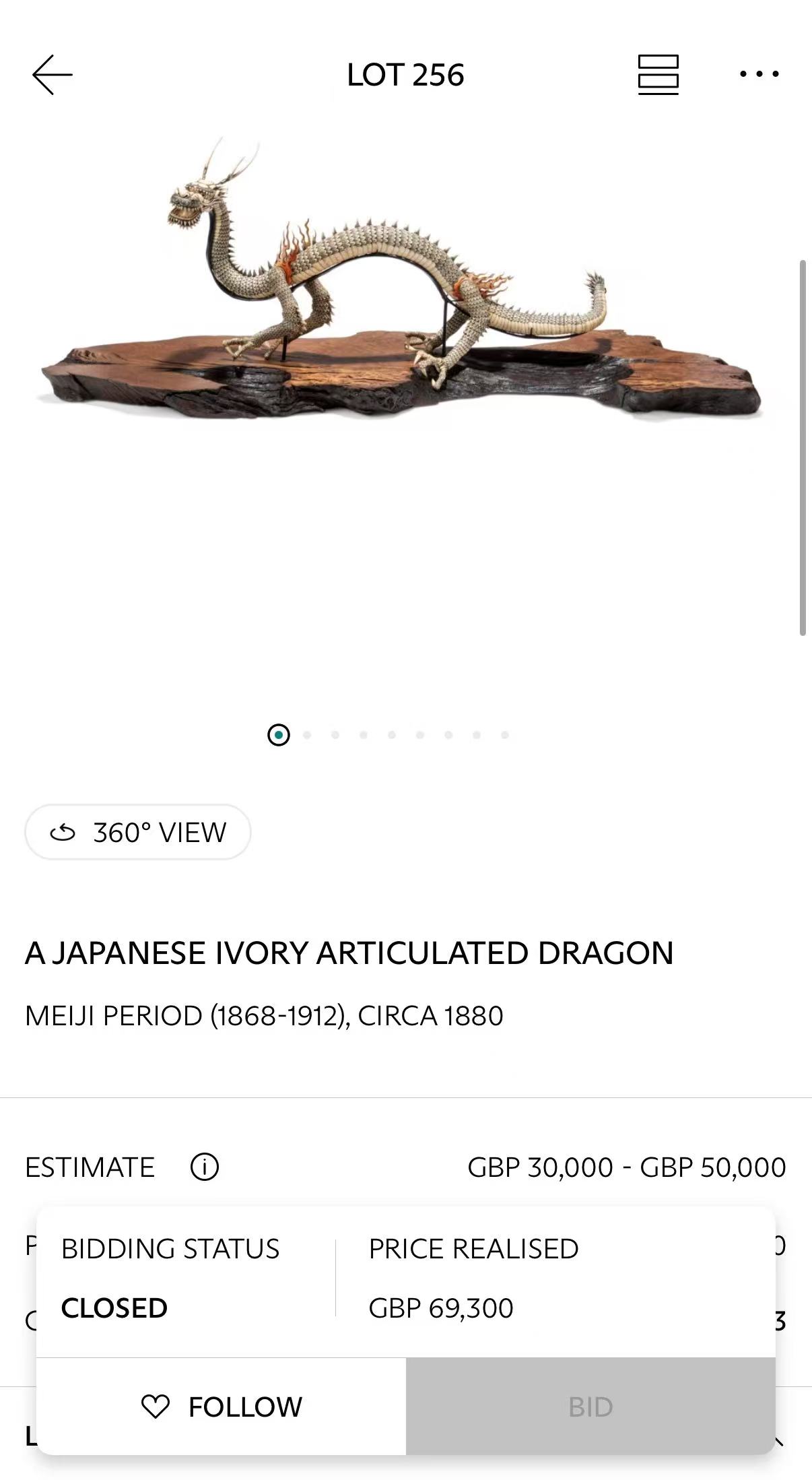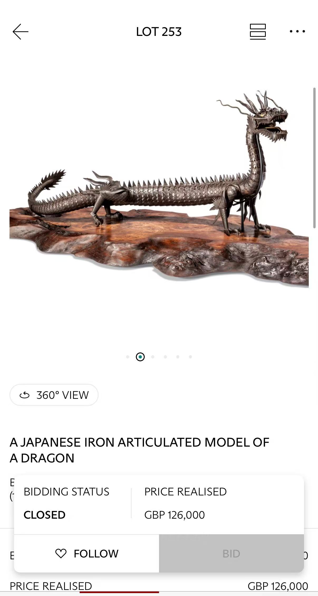 参考:两件类似的可活动龙形作品(其中一件为铁制,一件为象牙制)曾于2023年5月25日在伦敦佳士得拍卖行"私人三大收藏:贝尔格莱维亚、伯克郡与根西岛”专场中拍出:
