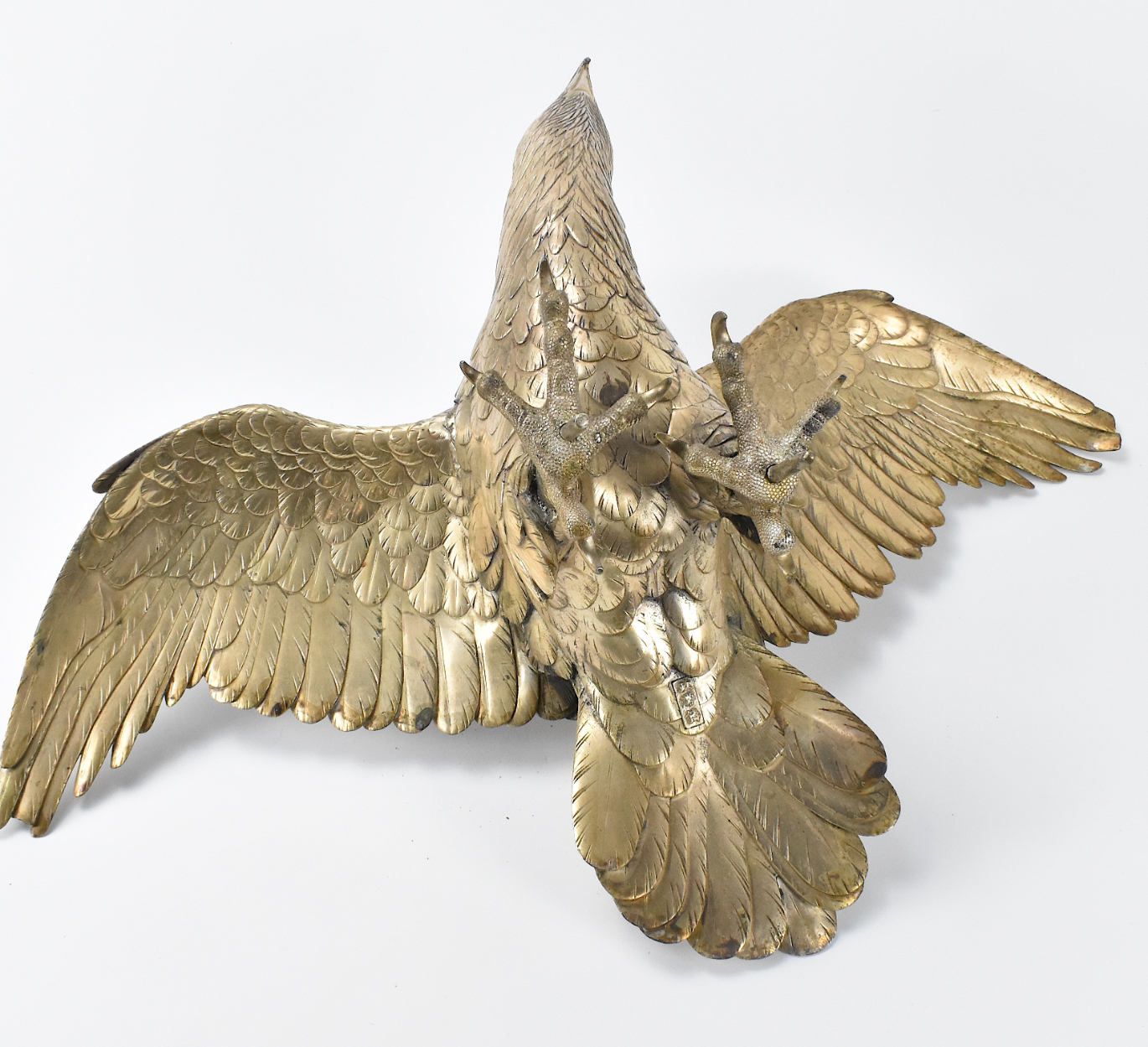 此为明治时期的一件日本大型银镀铜老鹰立铜枝摆件。威猛的老鹰栖息于一截虬曲的铜枝之上,以有力的利爪紧抓树皮。老鹰造型写实,以泛银光的铜质铸就,细节极为精致。