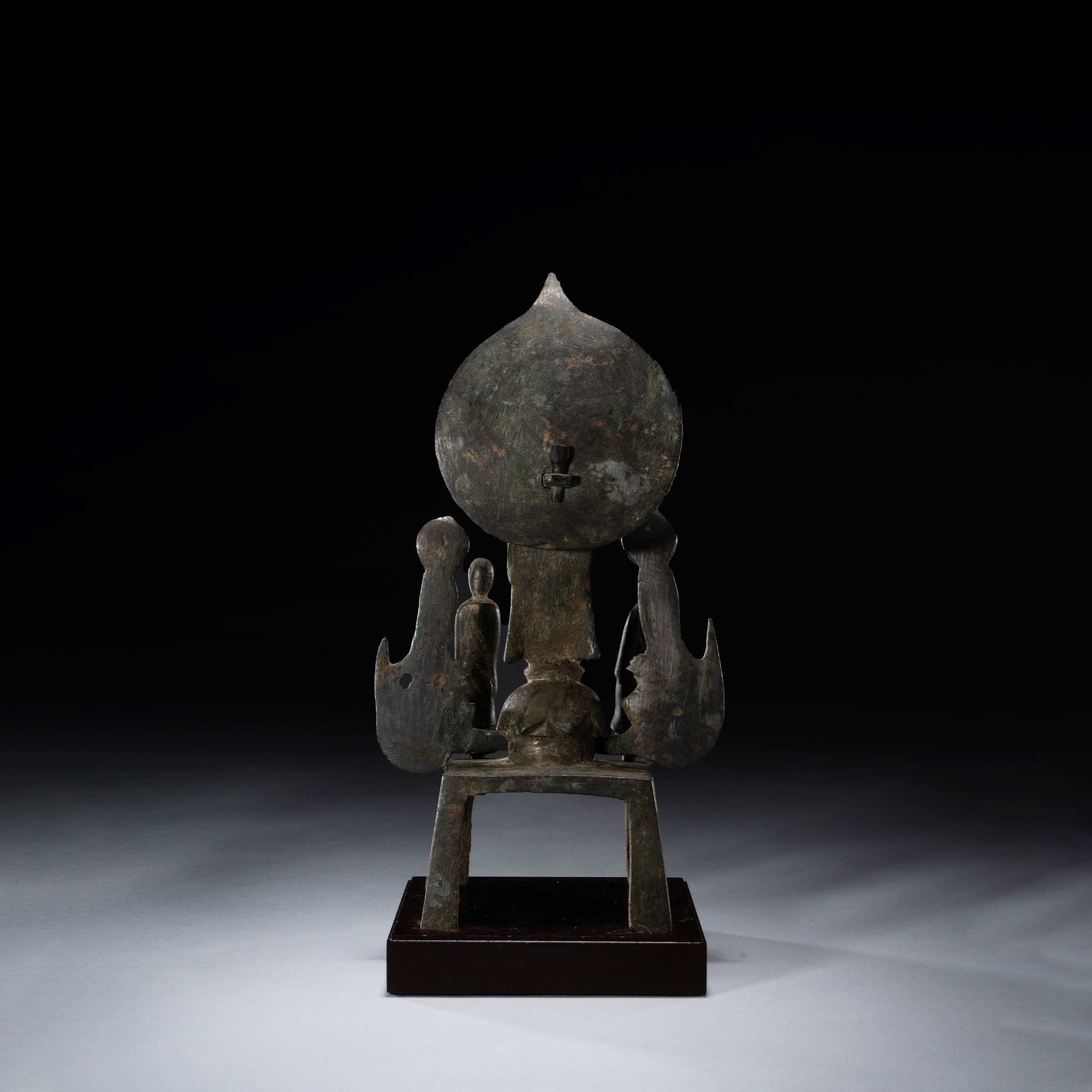 此造像属大型金铜佛精品。中心为如来立像,两侧配置脇侍菩萨,最前方则配置一尊弟子像(另一尊缺失),形成完整的五尊格局。弟子像神态年轻,展现出中国早期造像中典型的阿难形象。 如来像背后的舟形大光背顶部呈尖状,呈现出鲜明的东魏时代特征。由于东魏国祚仅十六年,其艺术风格深受北魏末期样式影响,但本品的莲瓣尖端呈三角形延伸,反映出造像艺术正迈向新时代的过渡美感。如来与菩萨立于覆莲座之上,基座为高耸的四足方座,整体造形庄严而雄厚。 此尊造像见载于羽田幸昌先生2012年出版的《微笑みの小金铜仏》(第27页),学术脉络清晰且流通可靠。东魏、北齐时期金铜佛多以分铸或接合方式制作,能以完整五尊形式保存至今者极为罕见,是研究中古时期佛教造像工艺最重要的实物参考。