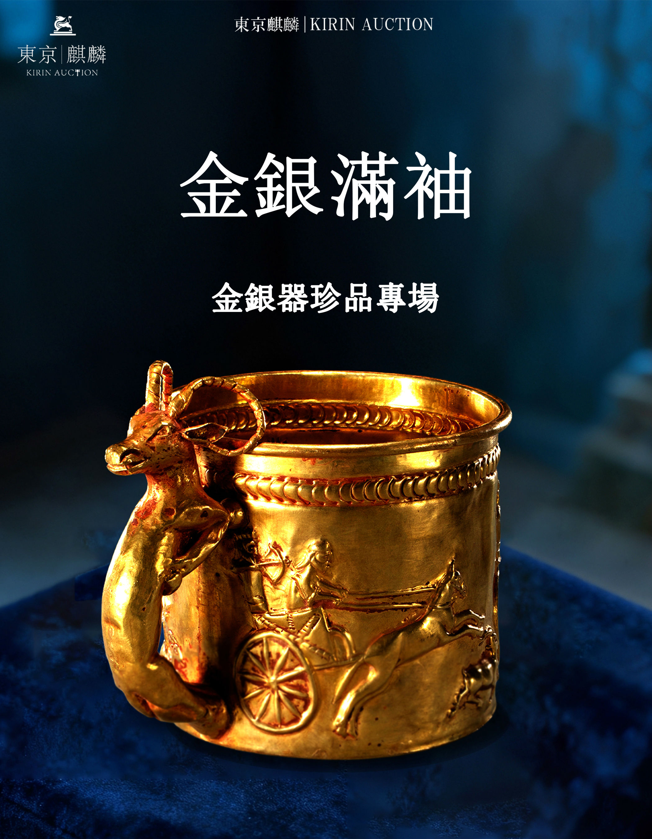 此杯采用纯金锤揲而成,色泽灿烂,造形奇特。最引人注目之处在于其「羊把」设计,杯柄圆雕一只站立的山羊(或称羱羊),双角向后弯曲成环,造形矫健生动,羊首细部刻划入微,与杯身衔接自然。这种山羊装饰元素深受中亚、西亚及欧亚草原民族艺术影响,是早期丝绸之路文化交流的物证。 杯身装饰极为繁复。口沿下及近底部均有一周饱满的「联珠纹」(或连珠纹),具有浓郁的萨珊波斯艺术风格。杯壁采用高浮雕工艺,描绘了一幕精彩的人物故事场景:画面可见奔腾的骏马、驾著马车前行的贵族,以及周围追逐的野兽,整幅画面充满动感,展现了契丹民族骁勇善战与狩猎生活的场景。 整器工艺集锤揲、焊接、錾刻于一体,金水厚重,局部呈现自然的氧化红斑(火石红感),显得古朴厚重。此器体积宏大,重达181克,在存世辽代金器中亦属罕见,是研究辽代贵族生活、装饰艺术以及东西方文化碰撞的重要实物资料。