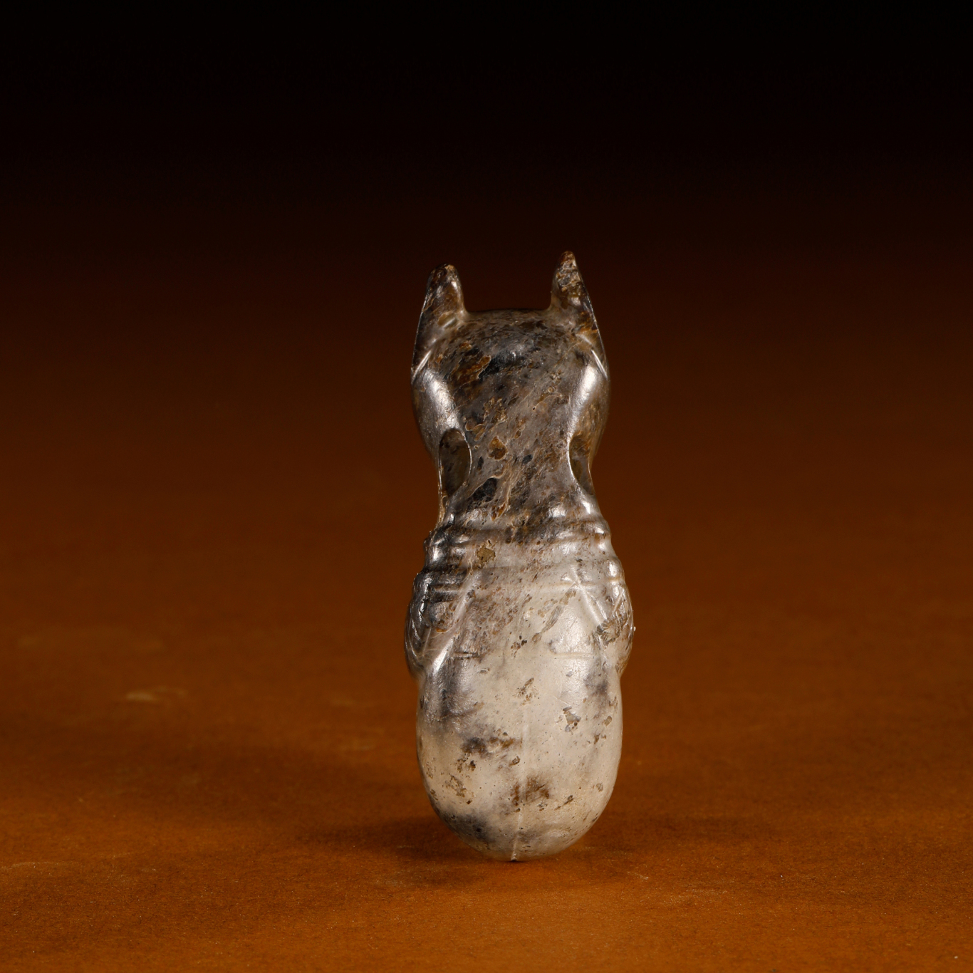 此坠选用优质青玉雕琢而成,质地坚密,全器受沁深重,表面布满浓郁的黑褐色与斑驳的红褐色沁迹,呈现出高古玉器特有的沧桑感与沈稳包浆。 造形上,工匠大胆地将兽首与虫身结合。兽首部微昂,双耳高耸如尖角,双目圆睁,口部略微前突,神态威严且带有原始的神秘感。首部后方装饰有细密的交叉网格纹,展现了红山文化中独特的装饰语汇。躯干呈蜷曲状,腹部以数道深峻的横向阴刻线表现出虫类或蛹类的节状特征。器身中段两侧对穿一孔,孔道呈现典型的「马蹄孔」特征,孔壁可见明显的螺旋磨砂痕迹,为当时手工钻孔的实物佐证。此器长 6.4 厘米,重 57 克,造形浑圆厚重,是研究红山文化图腾崇拜与早期玉雕工艺极其珍贵的实物资料。