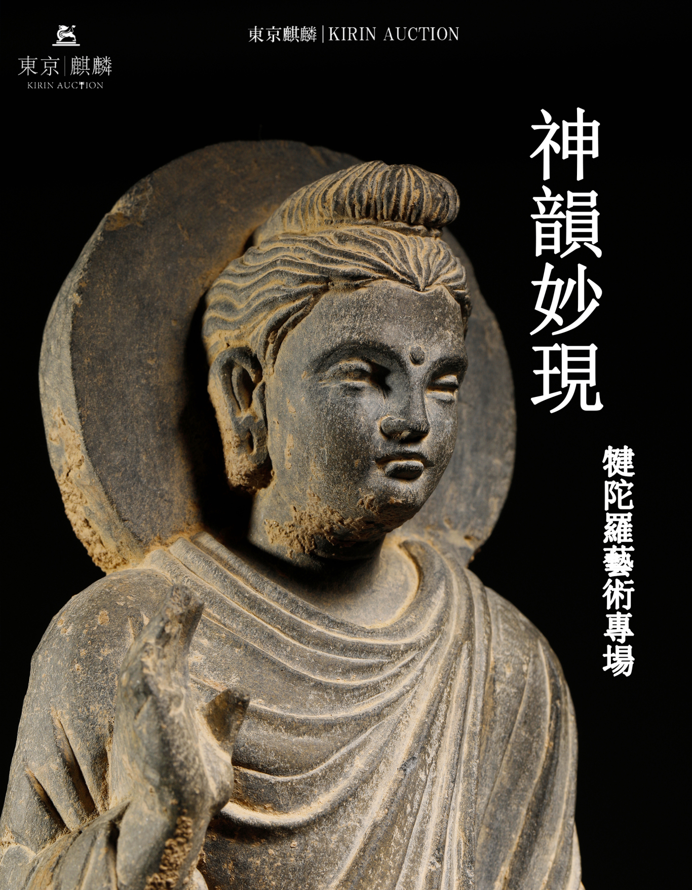 此尊如来立像以犍陀罗典型的灰色片岩雕凿而成,展现了公元三至四世纪大乘佛教兴起时期的艺术神韵。佛陀面容恬静,双目微垂,带有显著的希腊式雕塑特征:深目高鼻、嘴角微含笑意,展现出超越世俗的慈悲与庄严。佛首肉髻高耸,波状发髻线条流畅,反映了早期佛教造像对佛陀神圣形象的高度理想化处理。 最为精彩之处在于其通体披挂的厚重袈裟,衣褶层次丰富、自然垂坠,营造出一种沈稳的力量感。此造像连同专门配制的底座总高达 78.7 厘米,体量硕大,具有强烈的视觉冲击力。本品附有日本著名犍陀罗艺术权威栗田功(Isao Kurita)先生亲笔签署之鉴定书,来源可靠且艺术价值卓越,是丝绸之路中西文化融合不可多得的实物例证。