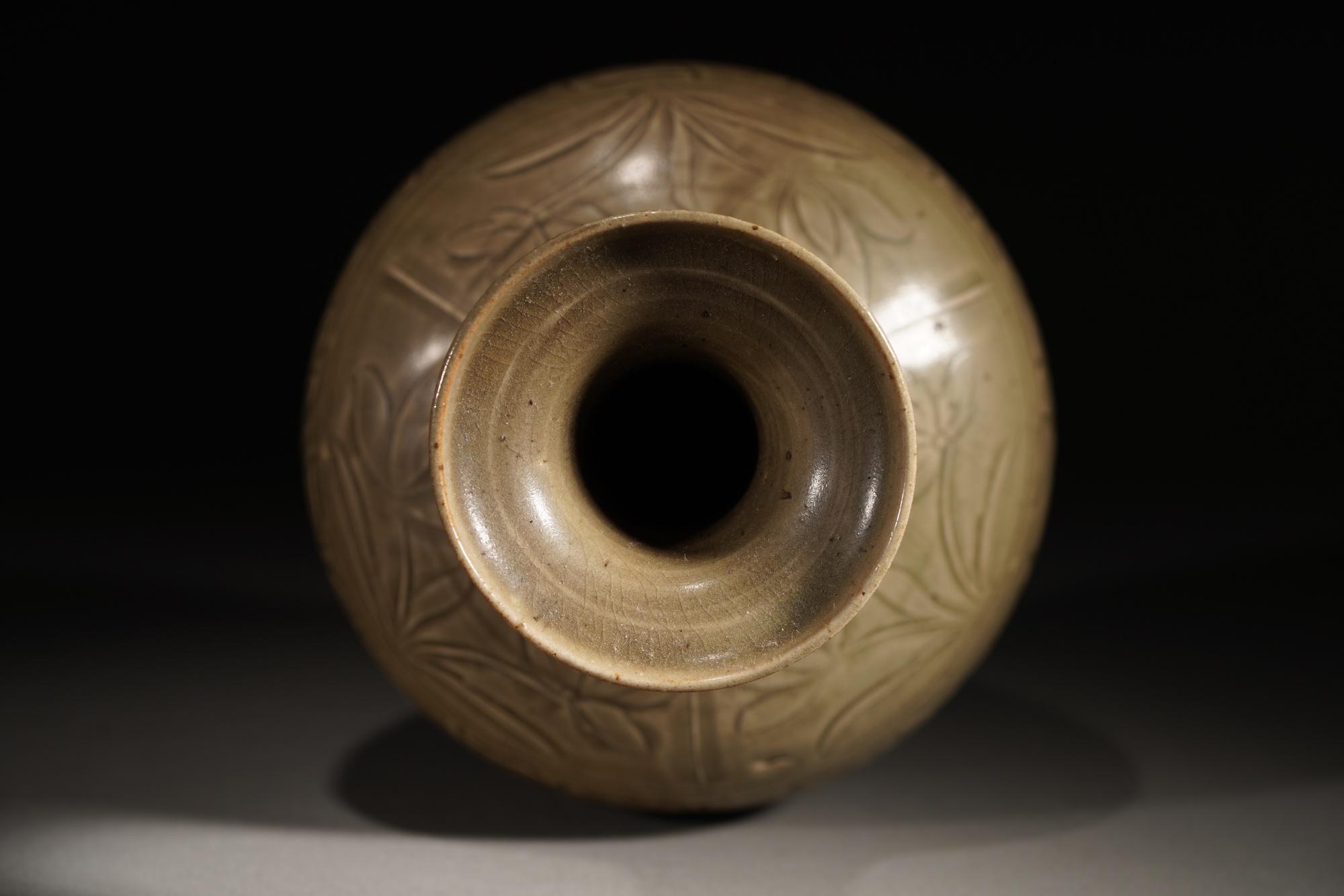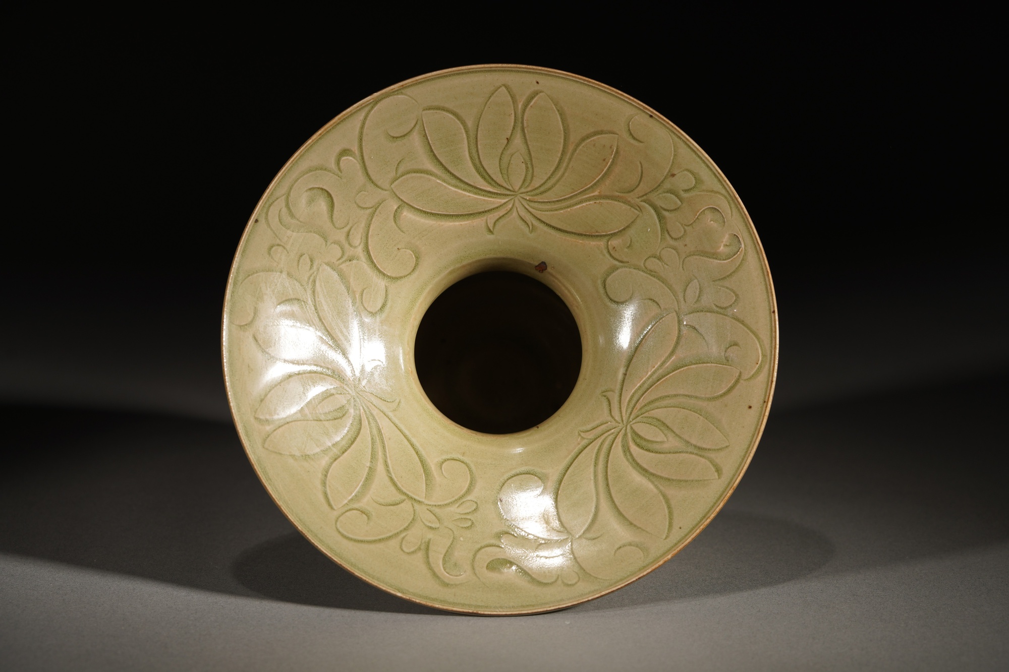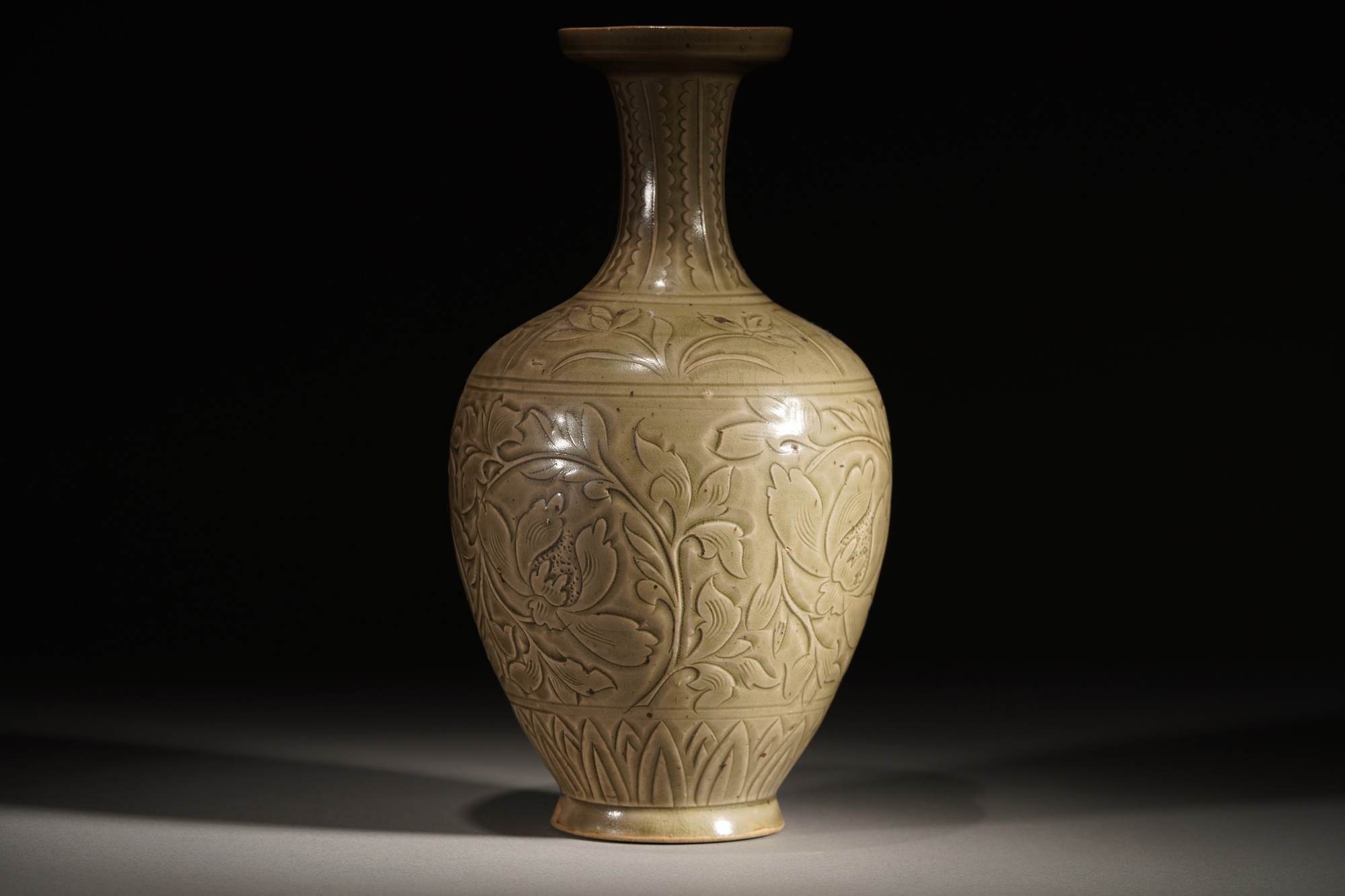 青磁刻花蓮花牡丹唐草紋光口瓶