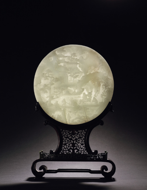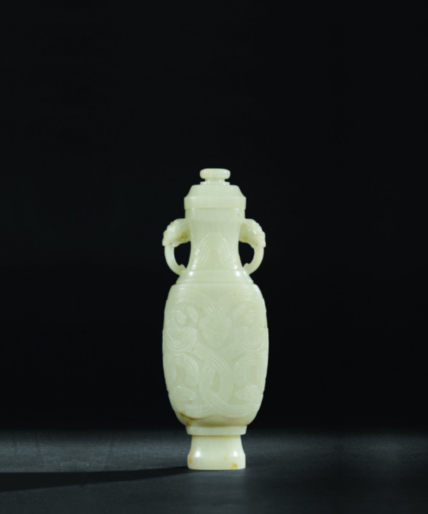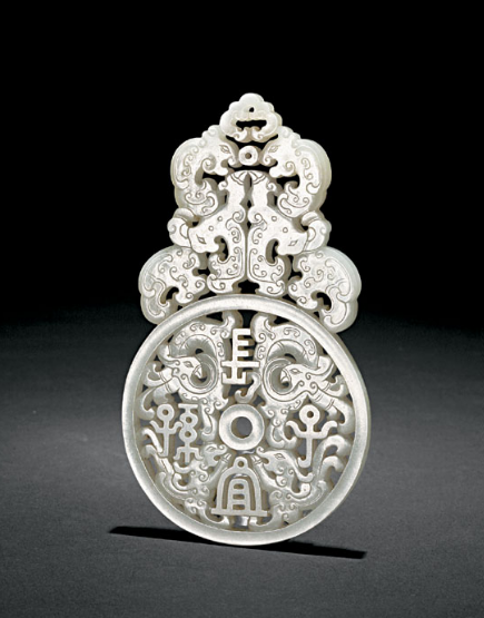 “清嘉庆白玉镂雕凤纹长宜子孙牌”和“清乾隆青玉雕仿古兽面纹提梁卣”