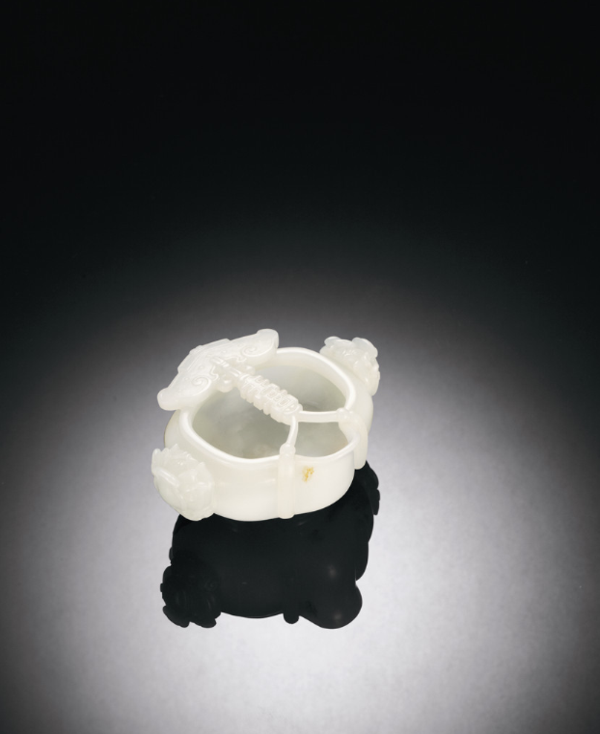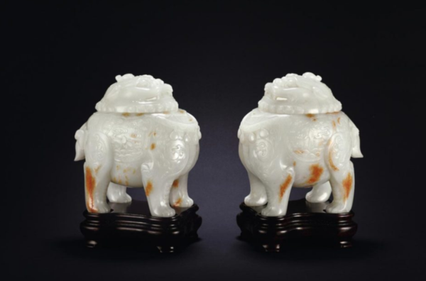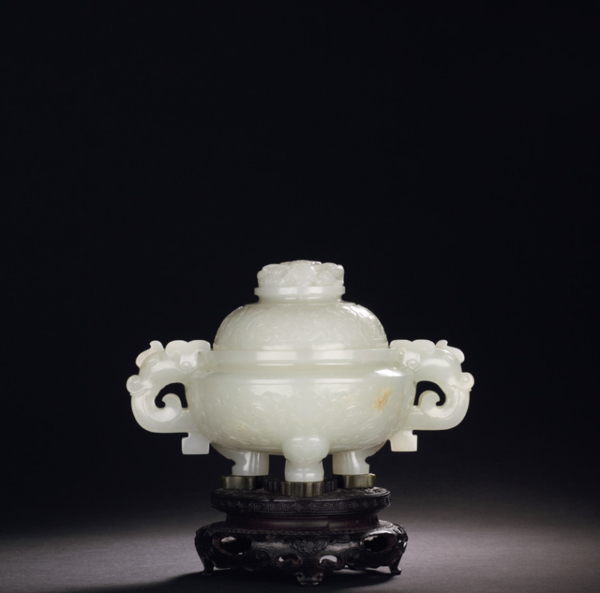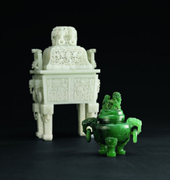 清乾隆白玉浮雕兽面纹仿青铜香薰与清乾隆 翡翠三狮钮双兽衔环三足炉