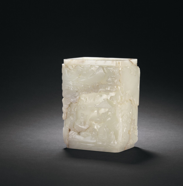 清乾隆 白玉镂雕“竹林七贤”纹方笔筒