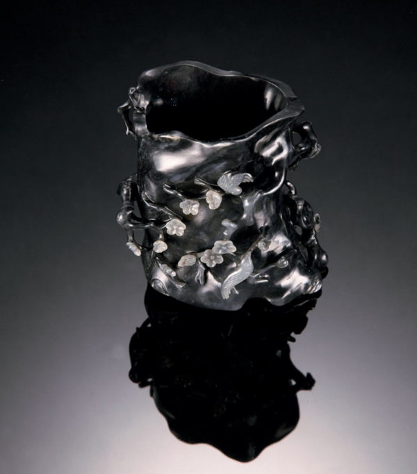 清-乾隆-黑白玉巧雕梅花笔筒