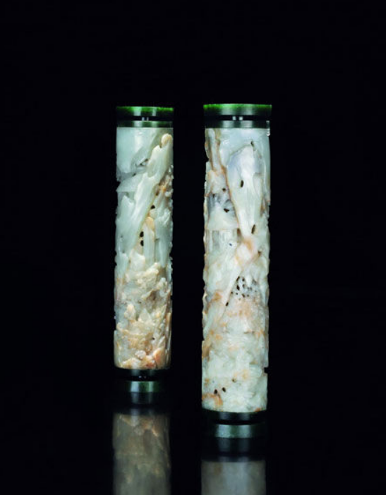 清乾隆-白玉山水人物纹香筒一对